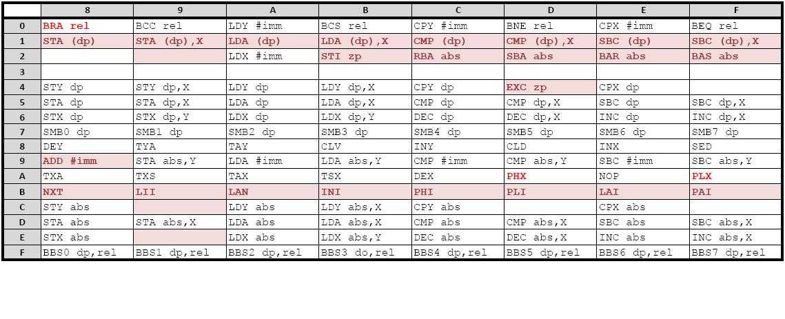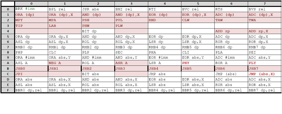 There may be some interest in the opcode map of the R65C19 and how it compares to the R65C02. Pink/Light Red Cells are opcodes which have different meaning than those of the R65C02. Cells with Red Font and a white background are the additions to the 6502 instruction set made by the 65C02. The bit-oriented instructions added by Rockwell are shown in normal black font and a white background in rows 7 and F.