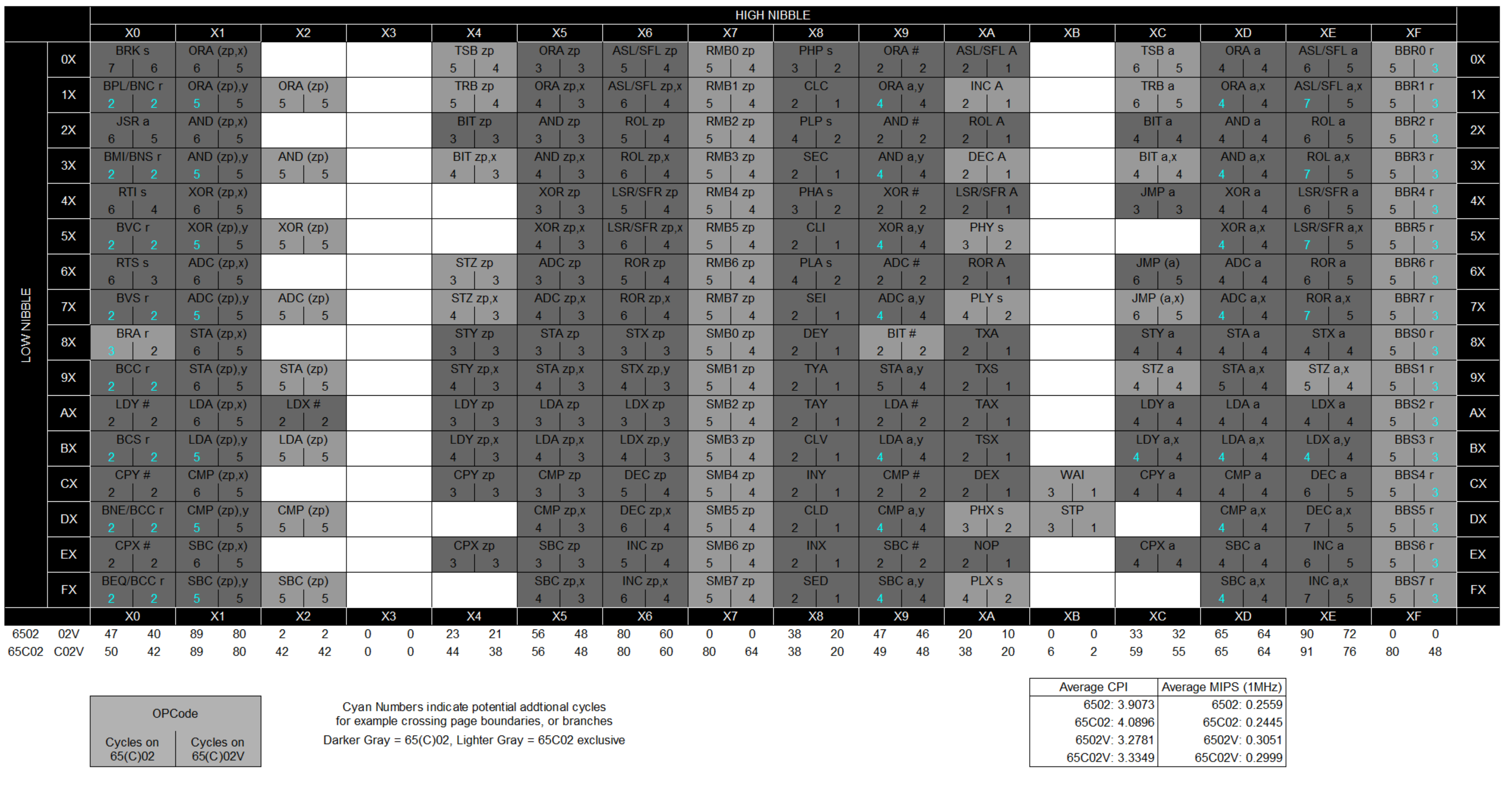 ps- Whenever possible I avoid WDC doc and refer to Rockwell doc instead. Of course that's no good for stuff like AC timing specs (the fastest Rockwell chips are only 4 MHz), but for many details including instruction cycle counts it's fine -- I'm sure the cycle counts are identical (overlooking the fact Rockwell has no STP and WAI instructions). I've even observed that the undocumented NOP's are identical.