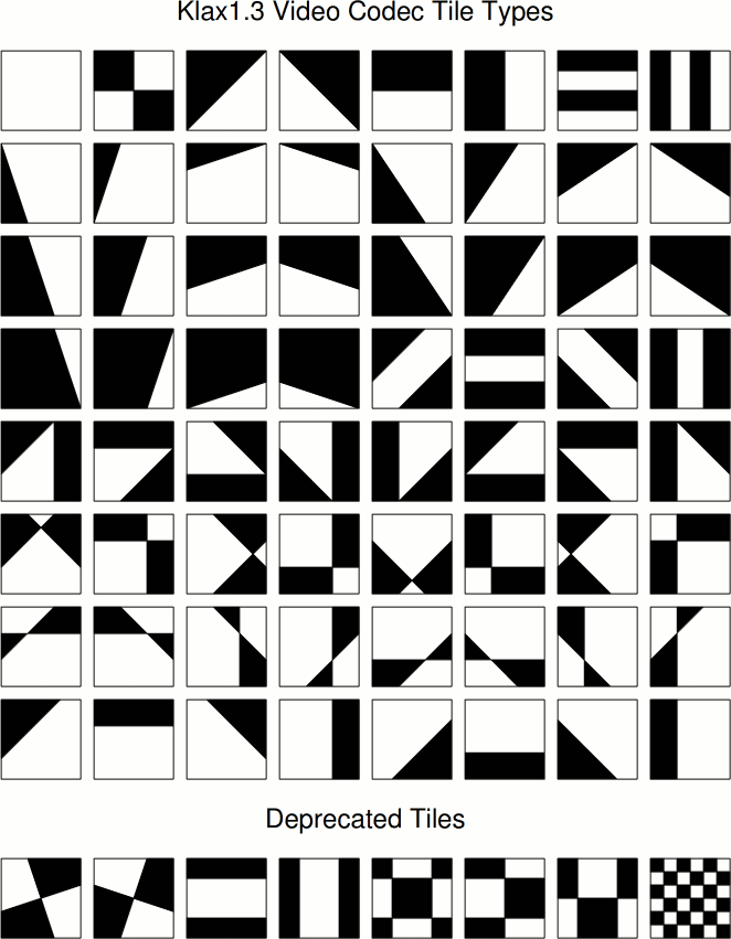 Given the long encode time of each test image, I often tweaked the codec while I waited. On multiple occasions and often within the span of 10 minutes, the encoder became incompatible with the decoder. Furthermore, I used test data with incompatible aspect ratio or frame rate. Under such circumstances, I burned through a few step revisions of Klax encoding before arriving at a stable Klax1.3 encoding. This defines a 36 byte header which includes width and height in tiles, frame rate and tile set. Such is my laziness, each binary byte of parameter is preceded with ASCII. As an example, width is defined as 'X' followed by high byte of the width followed by 'x' followed by the low byte of the width. This greatly aids debug when reading hex dumps and should be imitated more widely.