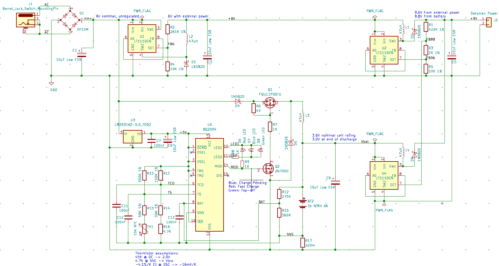 The BQ2004 still uses the linear regulator and buck-switching MOSFET for the actual charging circuit - that hasn't changed at all. I did correct the connection of one of the LEDs, for which I must have momentarily read the wrong part of the table in the datasheet.