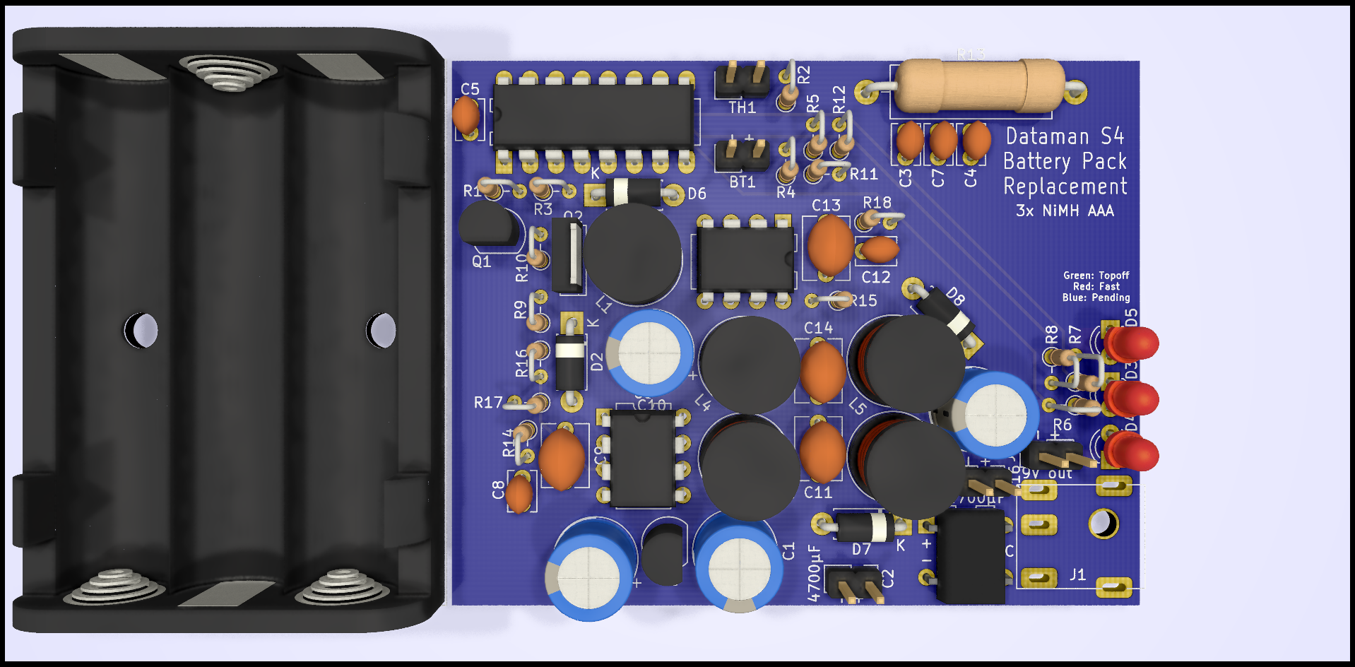 The official 7-cell NiCad pack offers about 5 watt-hours of capacity, but I can get 7.2 Wh from just three modern NiMH AA cells, costing a handful of euros from my local supermarket. The only problem is that the voltage has to be stepped up from 3.6V nominal to the 9V expected. NiMH cells are also a bit more finicky to charge in-situ than NiCad, and a 3-cell AA holder takes up slightly more space than the same number of cells in pack format. Armed with measurements of the original battery compartment, I determined I could fit a 47x53mm PCB in beside a 3-cell holder.