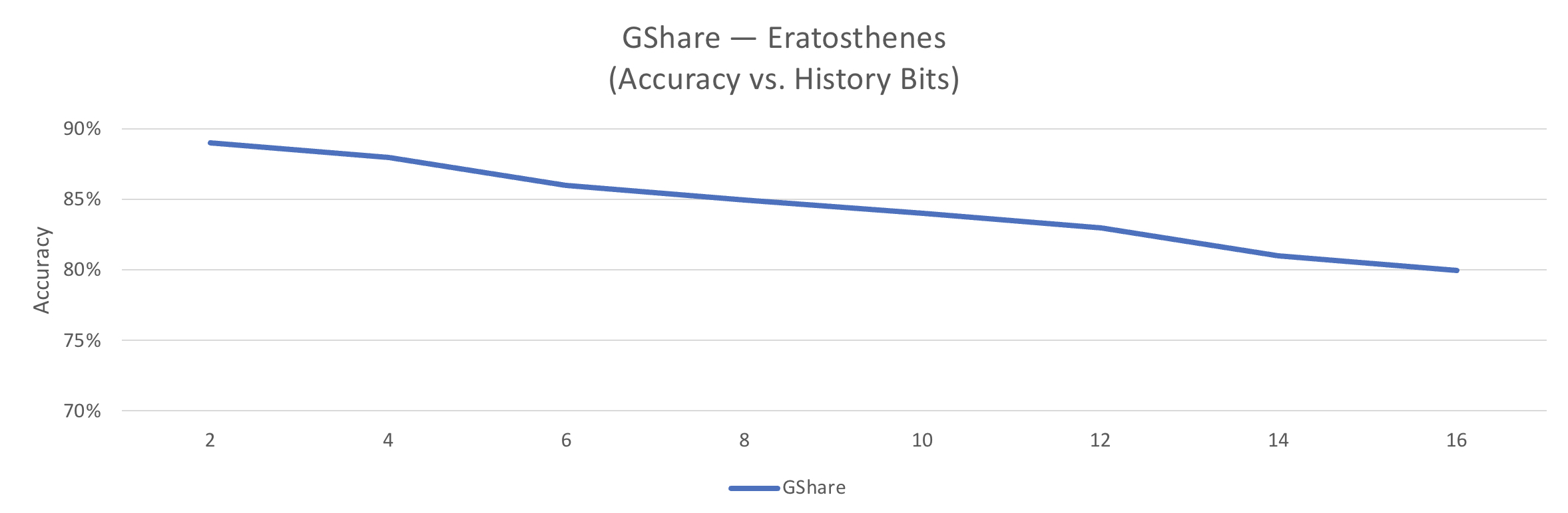 But there is one drawback to a large table: it makes the predictor harder to train. By way of illustration, see the graph below:This is the GShare branch predictor running on the Eratosthenes code with various widths for the Global History Register. At just 2-bits, we have a 4-entry pht, and the predictor performs much like a simple bi-modal 2-bit predictor. But performance suffers significantly as we add more history bits. While a 16k pht performs very well for the BASIC Benchmark with 9 Million cycles, a simple program like Eratosthenes is much better off with a simple bi-modal predictor. In general, it’s clear that GShare alone will struggle in situations where bi-modal will do well, and vice-versa. The obvious implication is to blend the two in a tournament predictor.