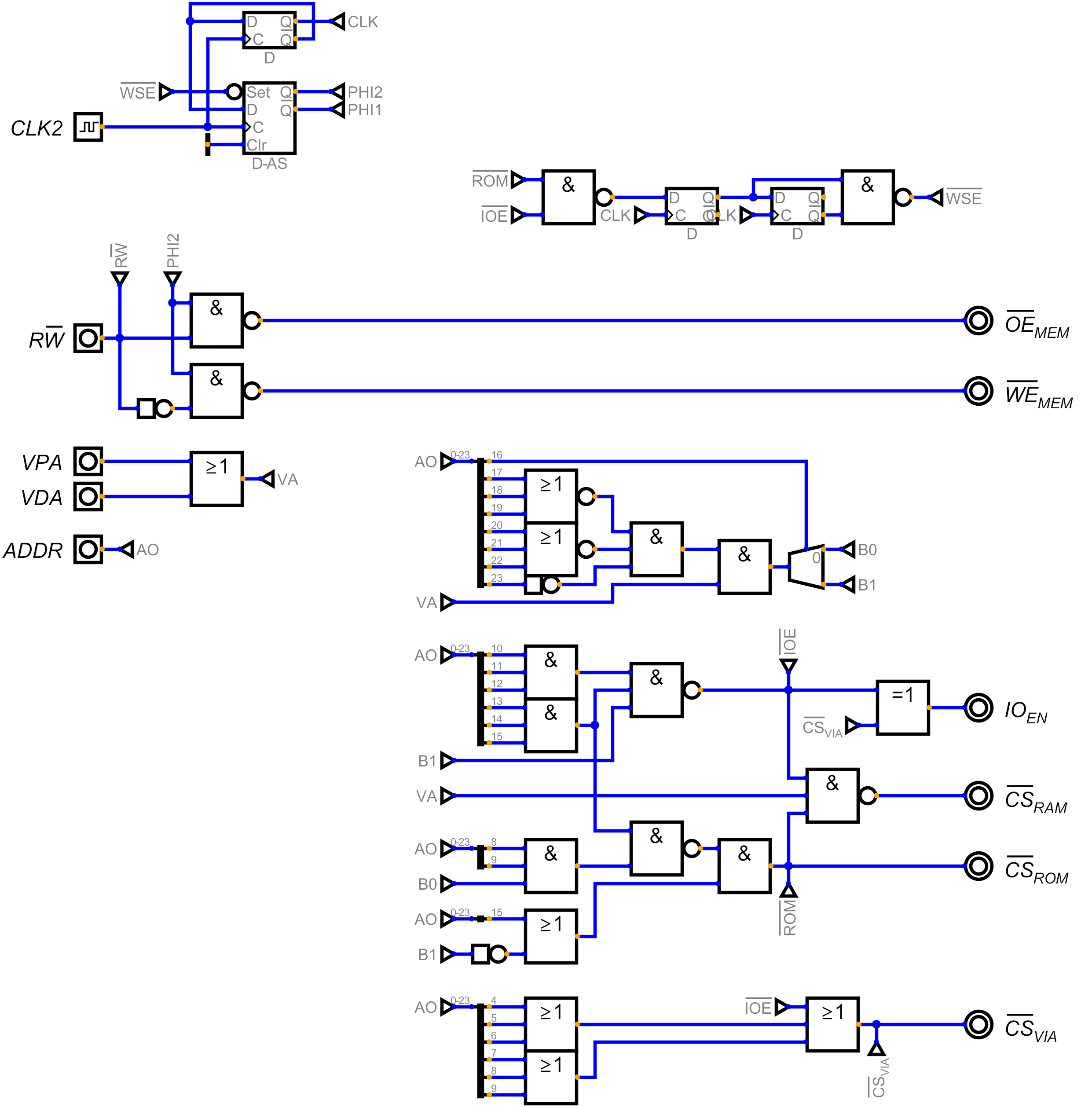 here the logic circuit: I am using the same clock circuit as in my current 65816 SBC, but the WSE (Wait State Enable) signal doesn't come from a CPLD this time, and the LVC series doesn't have a JK Flip Flop, so i opted to use 2x D Flip Flops instead. i'm thinking about replacing U14 and U24 with a single 2G79 (dual D-Flip Flop) to save 1 IC, as neither of those require the PRE/CLR inputs or make use of the inverted output.