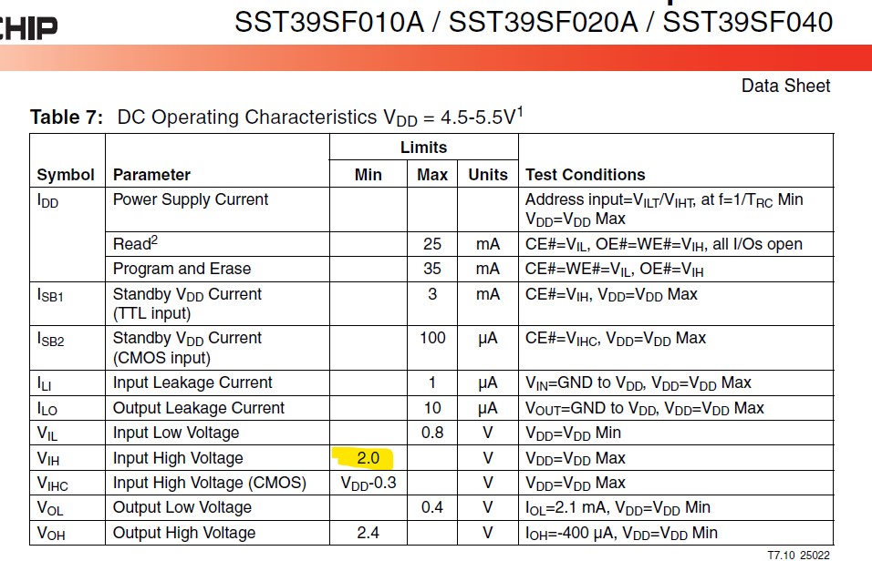 1) My 3V3 CPLD is sending address signals to my SST39SF040 Flash ROM. The ROM is powered by 5V. I have looked over the datasheet and I cannot find anywhere it says that 3V3 inputs are acceptable except for a tiny mention "TTL compatible". Right now I have 3.3K pull-up resistors to 5V on those lines so (in theory) the 3V3 signal from the CPLD is simply grounding when low and 'letting the resistors pull up' when high. At least that's my theory. I believe it still works without those resistors but I'm scared to touch this ... breadboard. I am aware of the SST39LF040, powered by 3V3, but it also says it's "max high input" is not 5V, so it doesn't seem 5V tolerant. Any experience with the SST39SF040 with 3V3?