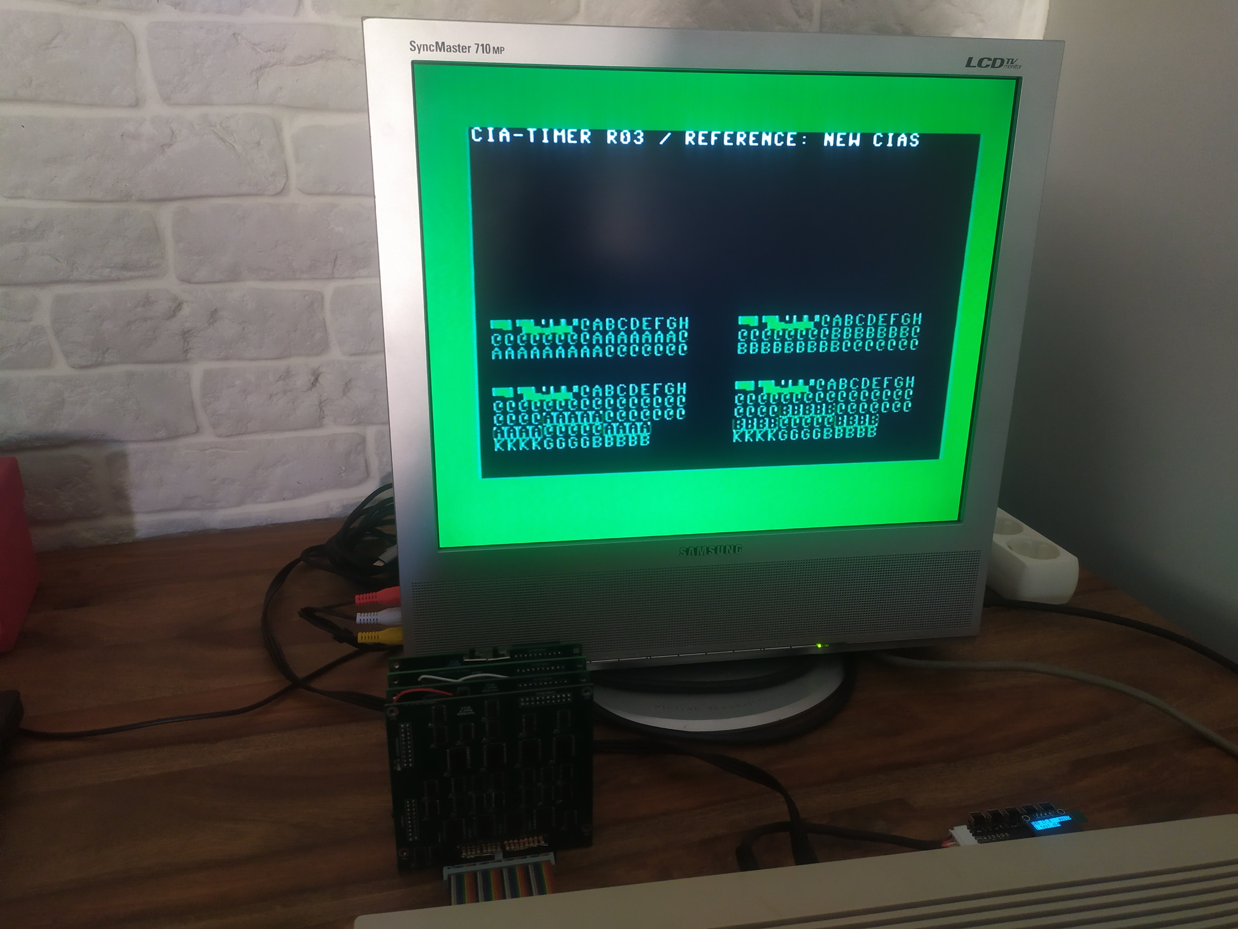 The left side tests are for TIMERA, right side for TIMERB. Also, in the two upper tests IRQ are disabled, and enabled on the lower. Within the interrupt handler, ICR and TIMER are sampled and outputted into the screen.