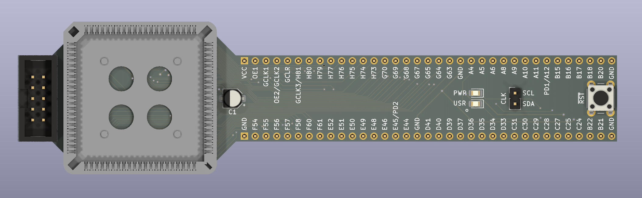 Last minute update to the design before finalizing my order: I added a spot for an optional clock oscillator connected to the first global clock input (GCLK1, 7.5x5.0mm SMD), to help generate high frequency signals such as video pixel clocks. And a spot for a bulk decoupling electrolytic.