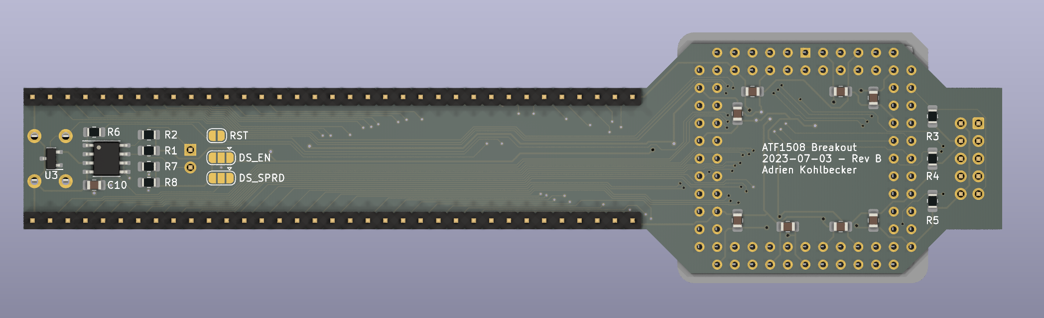 My goal was to use a slim "stick" format, with the CPLD hanging off to the side. This allows easy access to the pins of the device by keeping accessible two rows of holes on each side of the breadboard. In order to keep costs low because this is just an experiment, I went for a 2-layer design, assuming a breadboard will have poor signal integrity and grounding anyway. Additionally, I took care to group pins from each logic block, so it is easy to hook up related signals in an efficient way. I also added an option for local decoupling with SMD caps on the back.