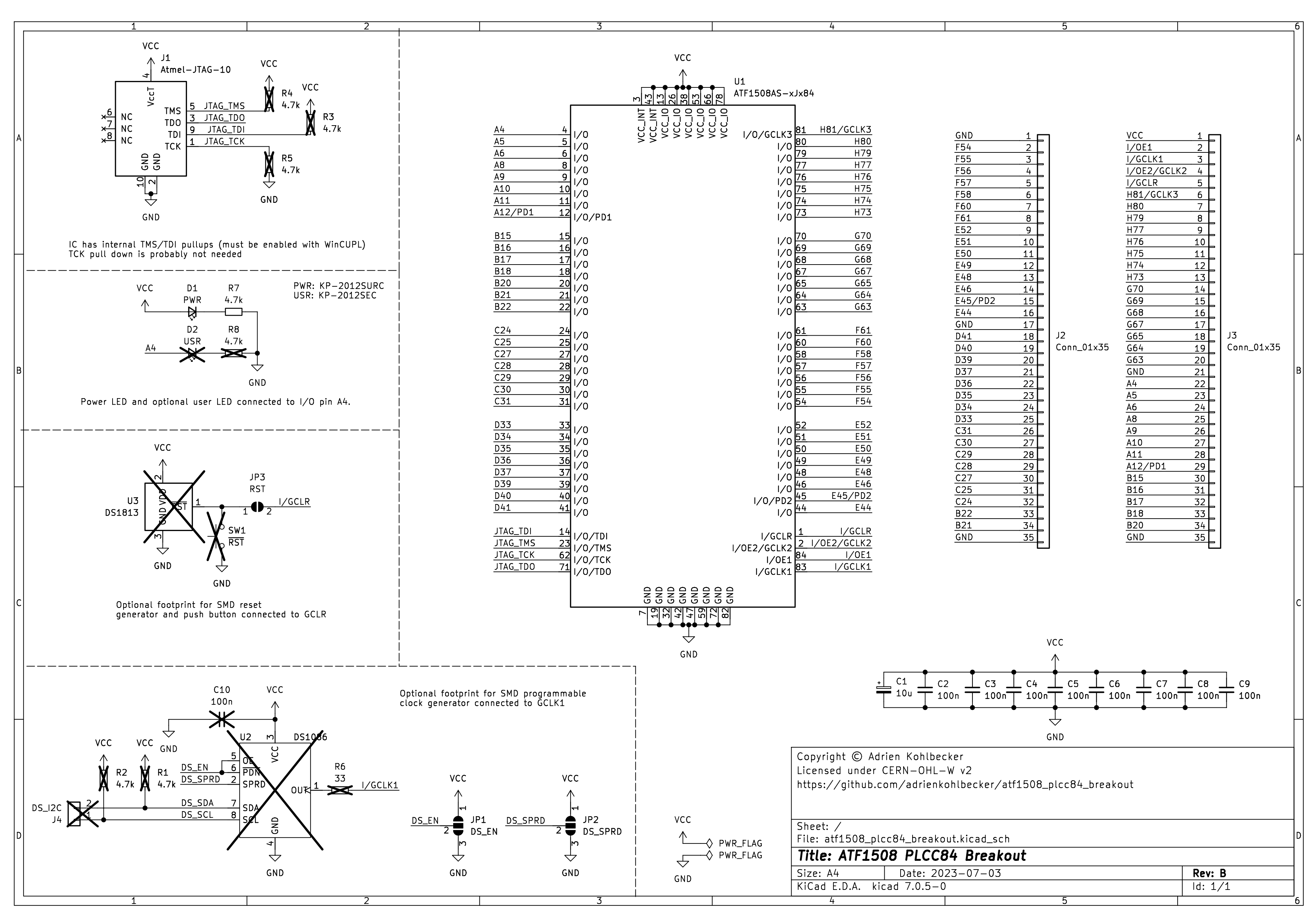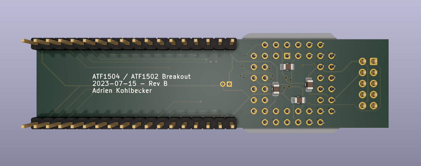 I recently wanted to use Atmel's line of CPLDs, namely the ATF1504 and ATF1508 in PLCC 44 and 84 respectively. In order to experiment with those chips on a breadboard, a small adapter PCB is needed. I'm sure it has been done already, but it was a fun little project!
