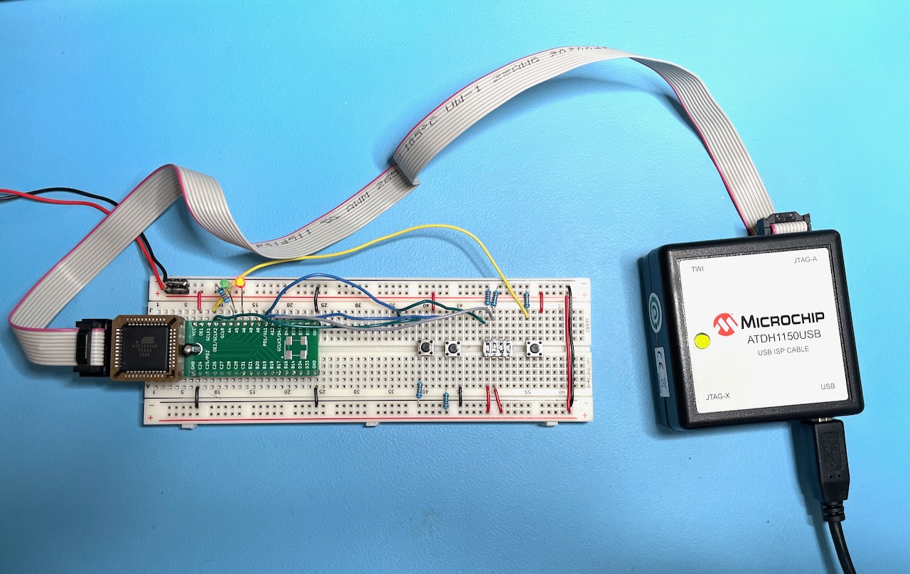 I then programmed both an ATF1504 and an ATF1508, using ATMISP and the official ATDH1150USB, and built a testing setup using push buttons, DIP switches and LEDs. The CPLDs were happily programmed and the logic seem to work as it should.