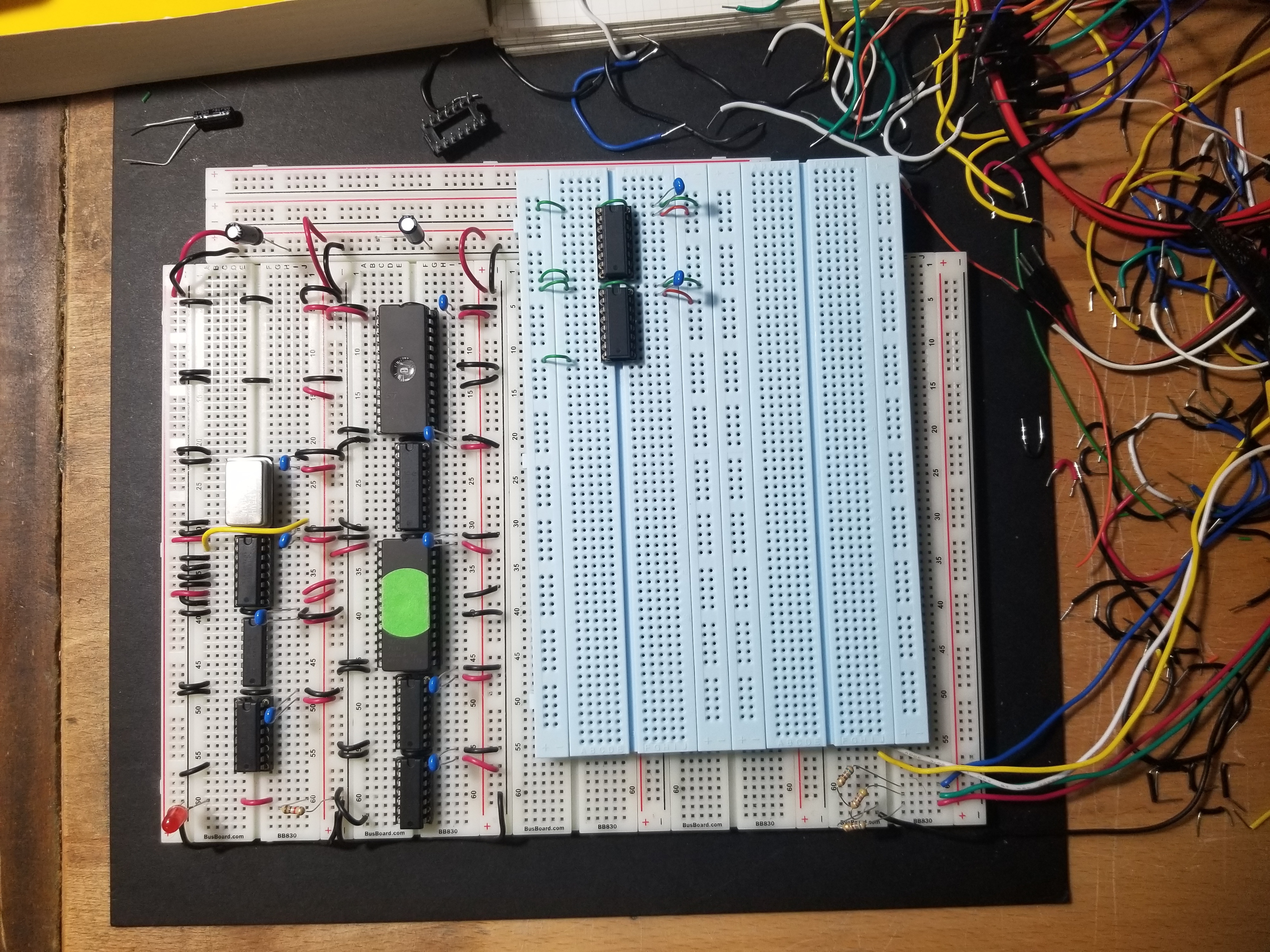 Incidentally, this is another reason I'm moving away from the BusBoard breadboards. I have a big stack of ethernet cable with 23 AWG wire. The jaws of the clips in the BusBoard breadboards are just a little too soft to reliably use the thinner wire. Depending on where you buy them, the Twin Industries ones that Radical Brad uses are a dollar or so cheaper than the BusBoard ones too. I think Mouser has them for $6.99.