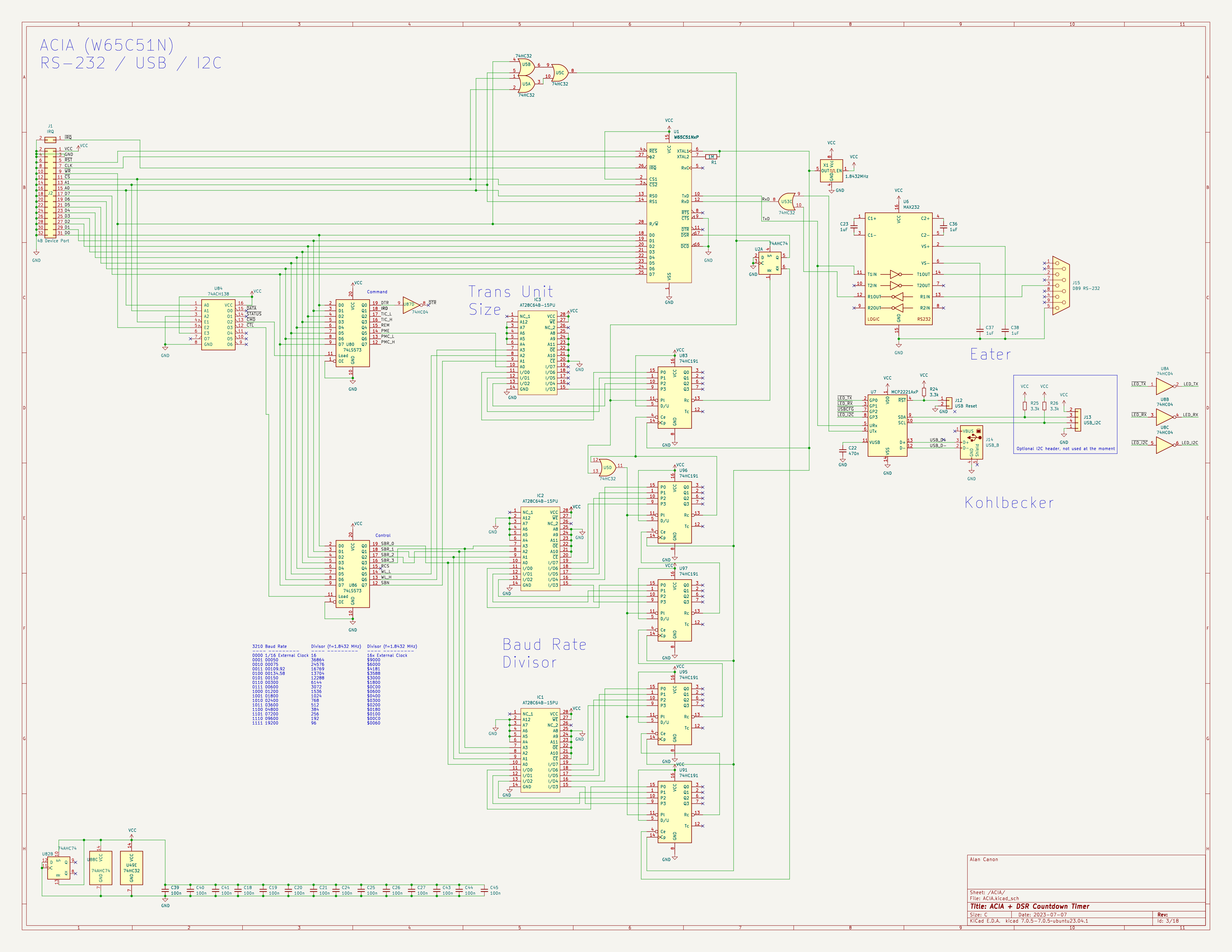 Here's a schematic with both your and Ben's ACIA circuits on it. I put an OR gate so that the ACIA can listen in on both yours and Ben's lines at once, and I fork the transmission line so that the ACIA can blast serial out over DB9 RS-232 and I2C at the same time. It is 2023, not 1983, and desperate times call for desperate measures. We need to act quickly before IBM and Apple come to dominate the PC market.