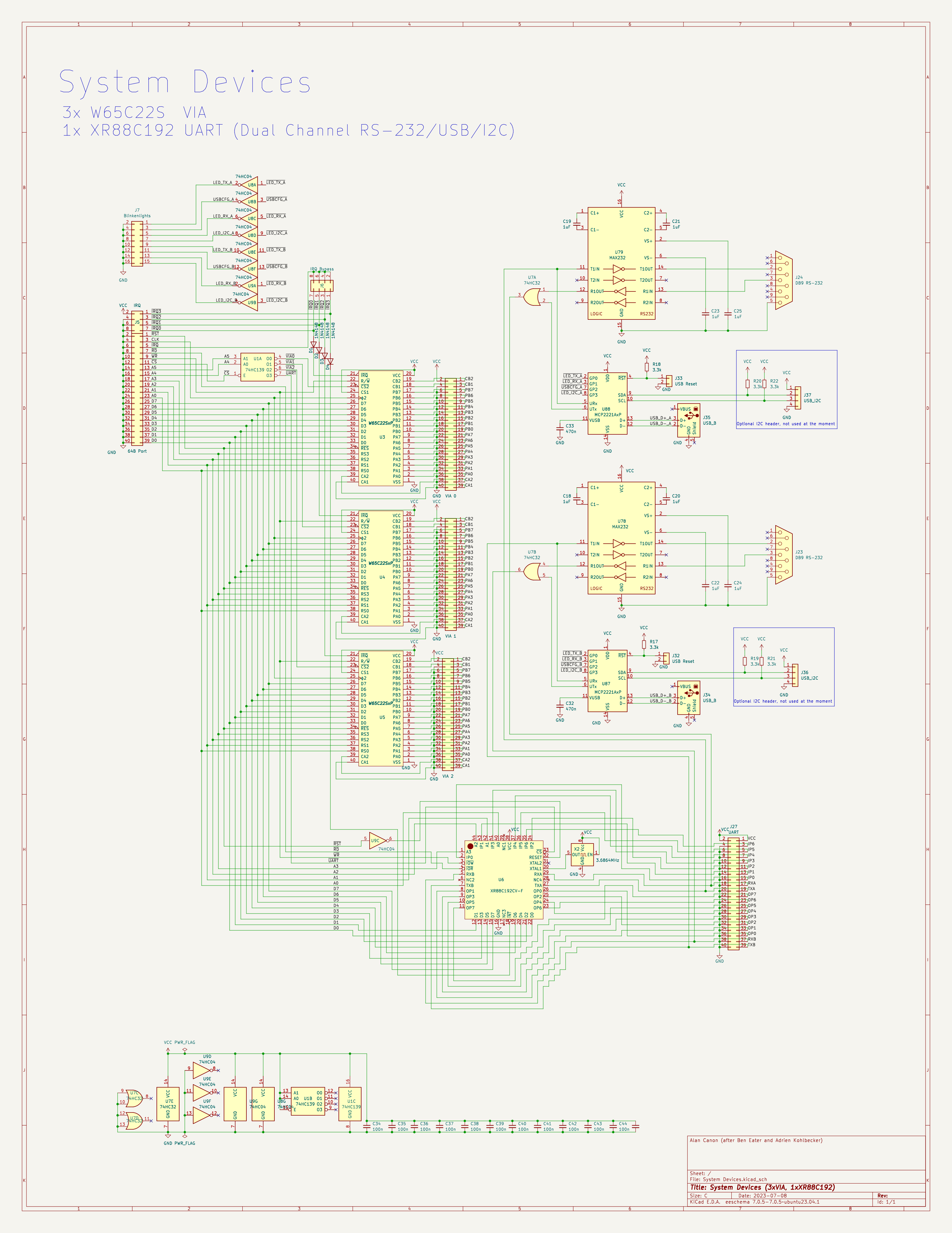 The two serial ports should be sufficient for a teletype and/or high speed paper tape reader. It would be possible to adapt my schematic pretty easily for any combination of four VIAs/UARTs. (2 VIAs, 2 UARTs, 4 UARTS, etc). At 16 bytes of register space per UART, 2 serial channels per UART, one page of address space could manage 32 modems, which would make for a fairly killer dialup BBS setup. Filling the top 255 banks of the 65816's address space with UARTs allows up to 2,088,960 serial devices, which ought to be enough for anybody.