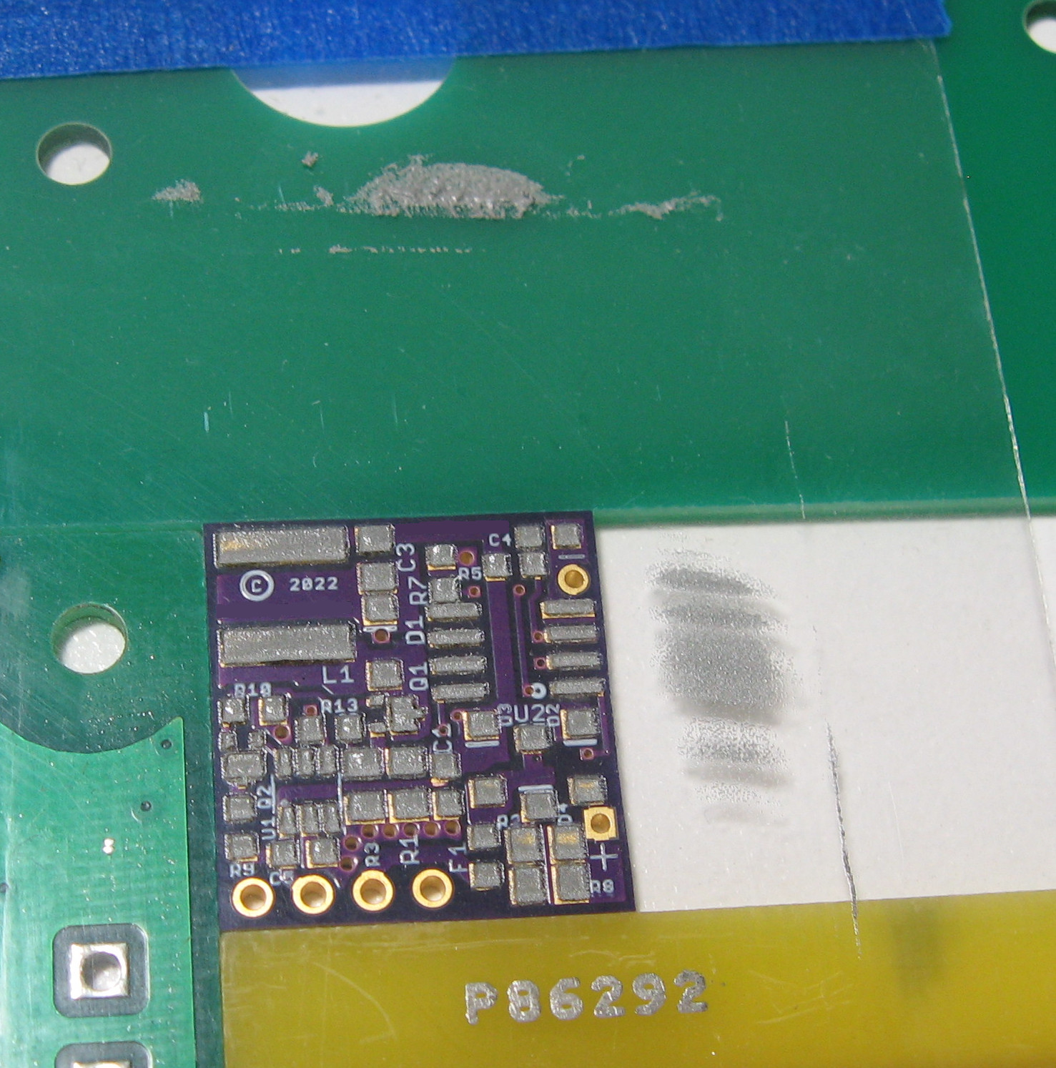 This is the board pasted with a single squeegee pass (squeegeeing away from the tape hinge). You can see I didn't completely fill the inductor pad in the top left and a few pads in the lower right. I chose not to do a second pass because that risks messing up the good pads and I have at least 50% paste on the pads. Almost everything with work fine if it's at least 50% good enough.