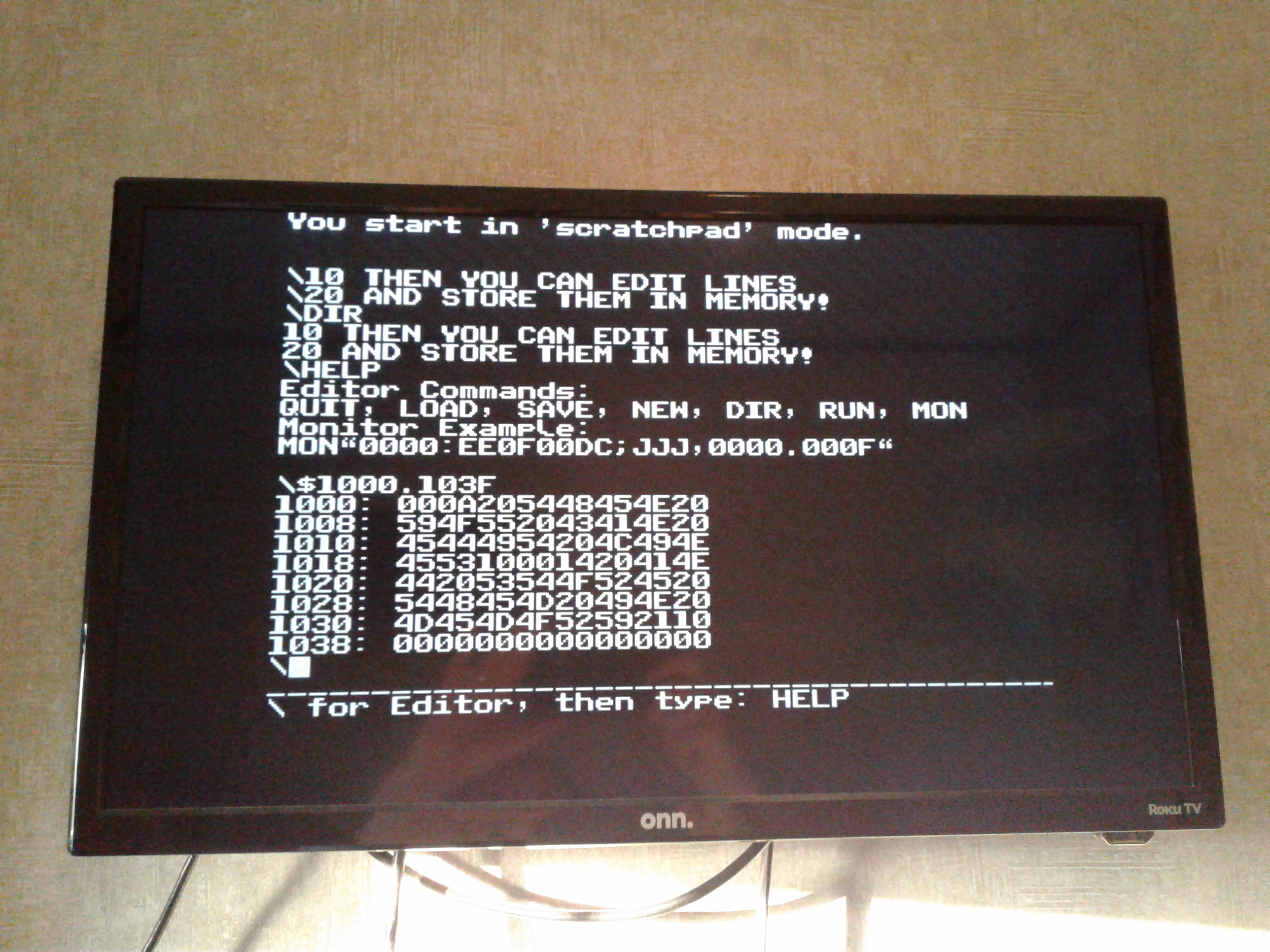 Right now it has a flavor of Wozmon inside the line editor. That means you can type out, modify, run, save, and reload a number of monitor commands. Or you can directly access the monitor commands with the $ symbol.