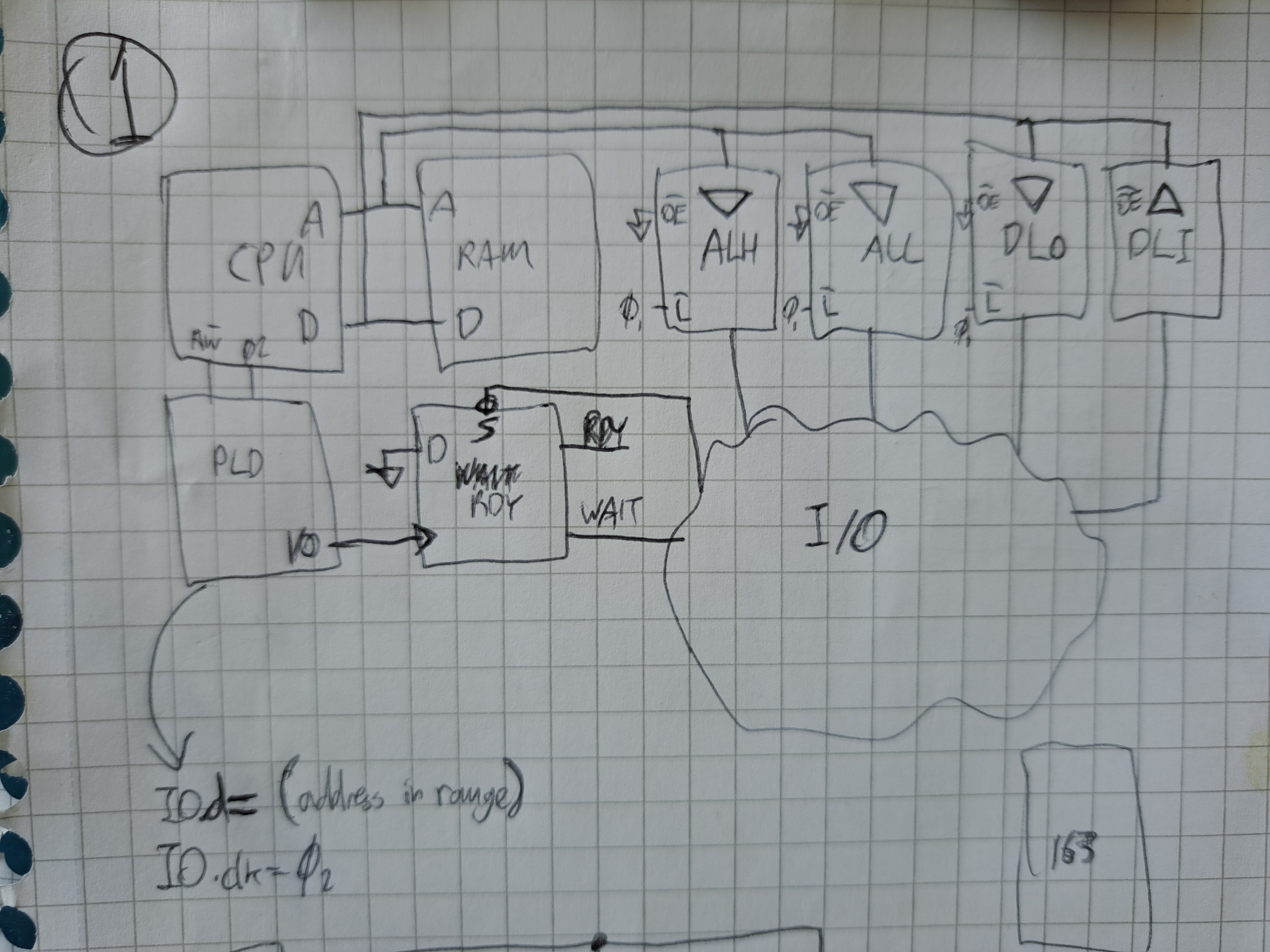 I saw your clock stretching using a '163 idea. I could possibly also consider using a multiplexer to switch between copying the oscillator output and outputting a constant high level, based on the current IOWAIT/RDY state. I haven't thought of any downsides to clock stretching.