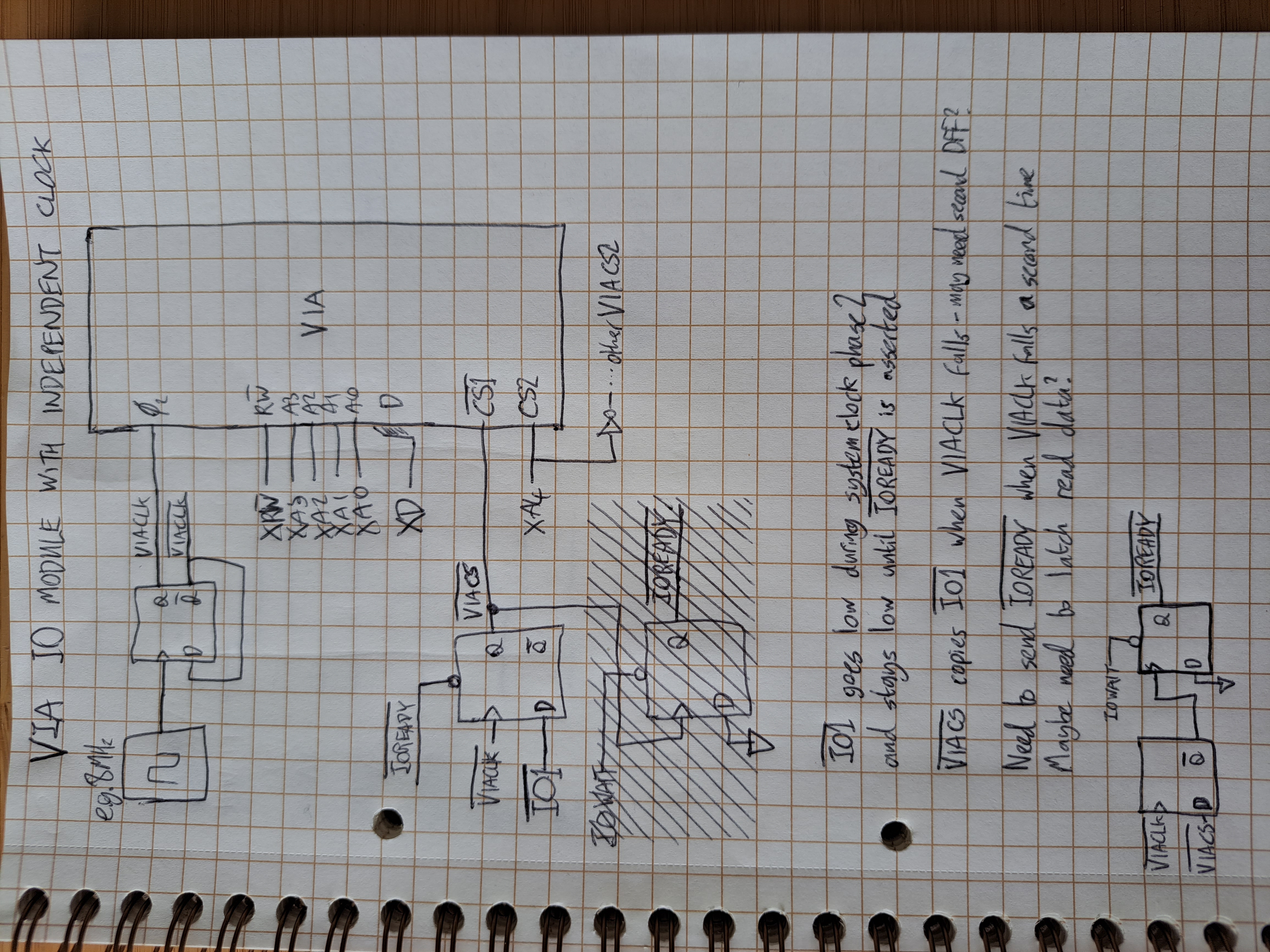PHI2 is the core CPU clock, and IOWAIT and ~IO1 are as discussed above. VIACLK is the VIA's local clock, and ~VIACS is its active-low chip-select signal. ~IOREADY is as discussed above - we need to bring it low when we're ready for the CPU to unpause. I also sketched in the periods where the XD data bus has valid data from the CPU for writing, and when it needs to have valid data for the CPU to read (unfortunately almost off the right hand edge of the diagram). This does imply I need to latch the data from the VIA for the CPU to read, as the VIA itself won't hold the data valid for very long after its clock falls. As I mentioned earlier, I think latching this when ~IOREADY falls is probably a good option, so that the VIA I/O submodule's only responsibility is driving ~IOREADY low at whatever time it needs.