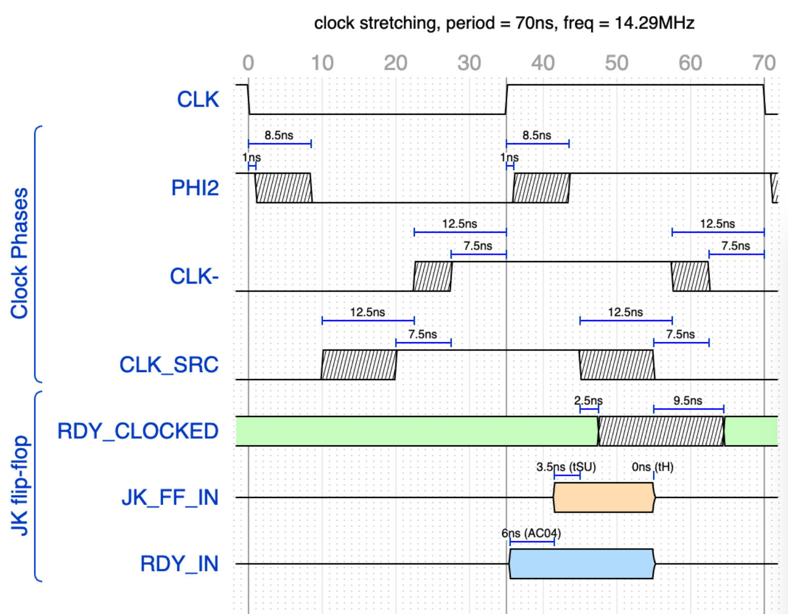 As you can see, all this logic adds quite a bit of delay. If I shift the diagram to the point of view of PHI2, which is what the CPU and the user will see, we get the following