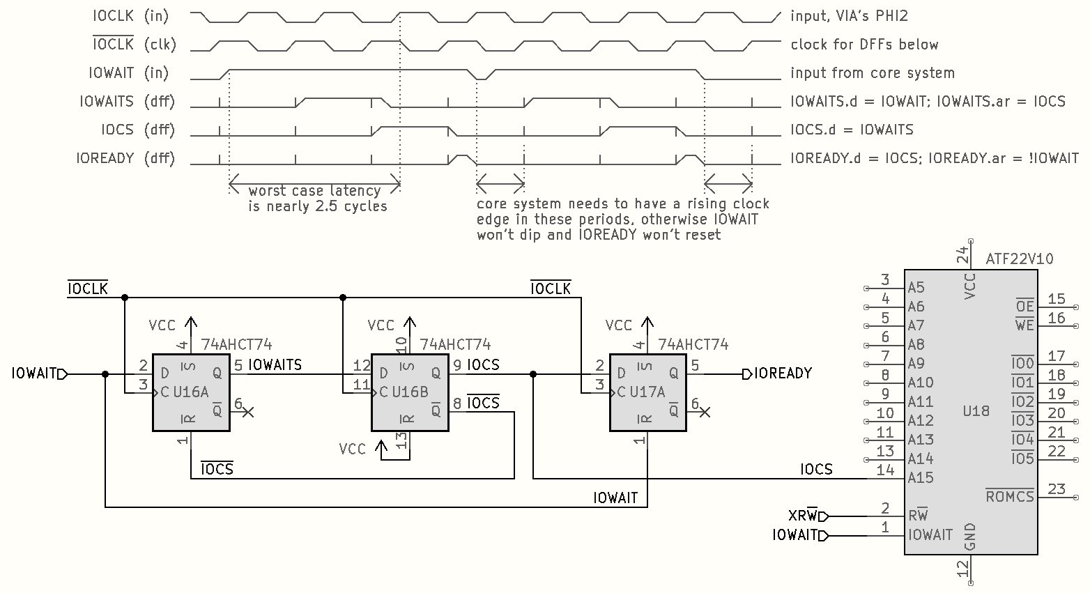 IOCLK is probably 4MHz, we have two flipflops in a row before IOCS is generated so hopefully decent metastability safeguards, one more flipflop to generate the IOREADY signal, and no extra glue logic needed so the only propagation delays are in the flipflops which are all clocked by IOCLK.