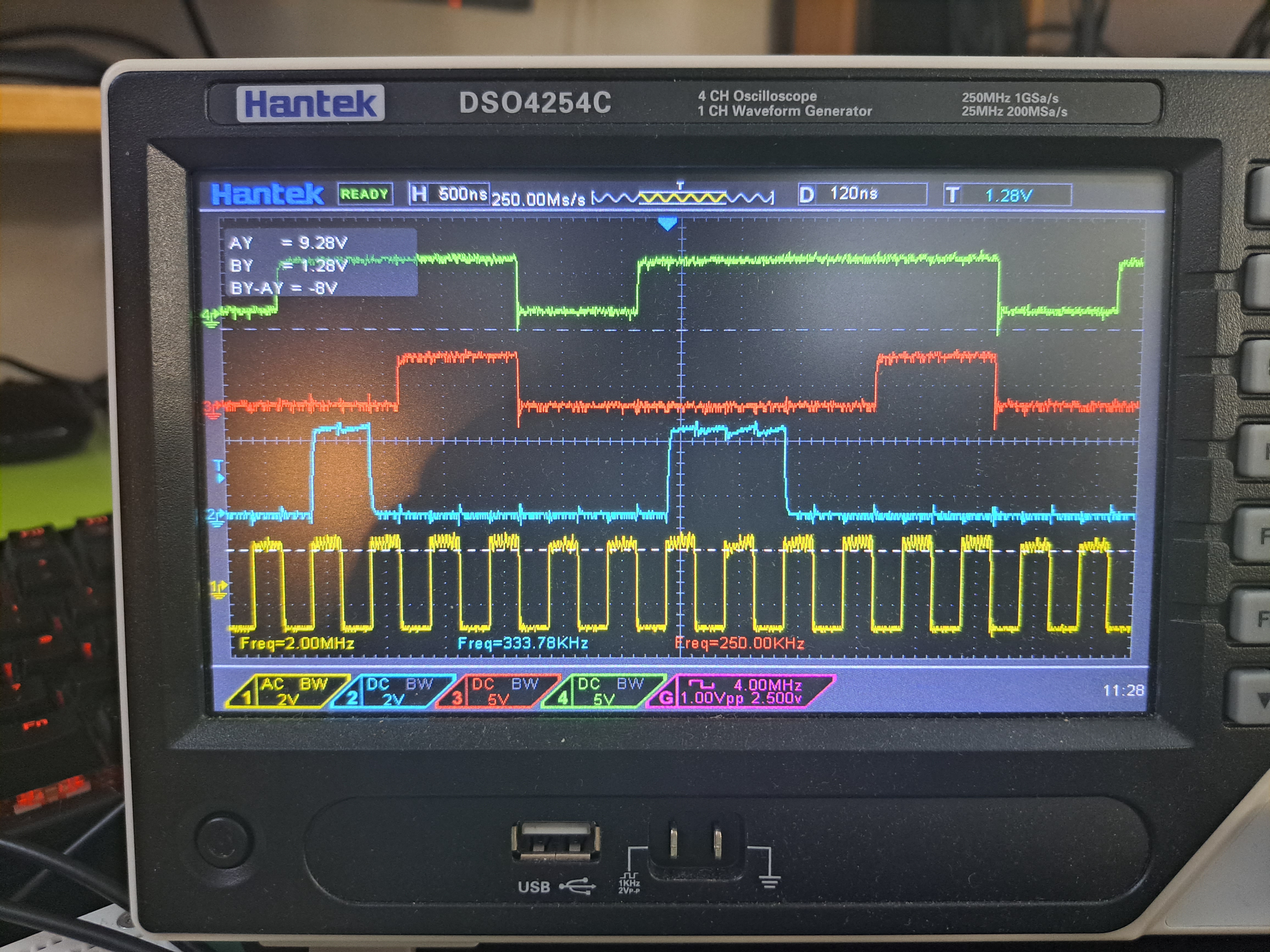 It's worth noting that the CPU isn't really running at that speed because it's constantly waiting for the I/O module. I added more probes to signals along that path to check they were behaving as expected - this shows PHI2 in yellow at the bottom, RDY in blue above it, then IOWAITS in red, and an active-low ACT signal which is where the I/O module performs the actions requested: