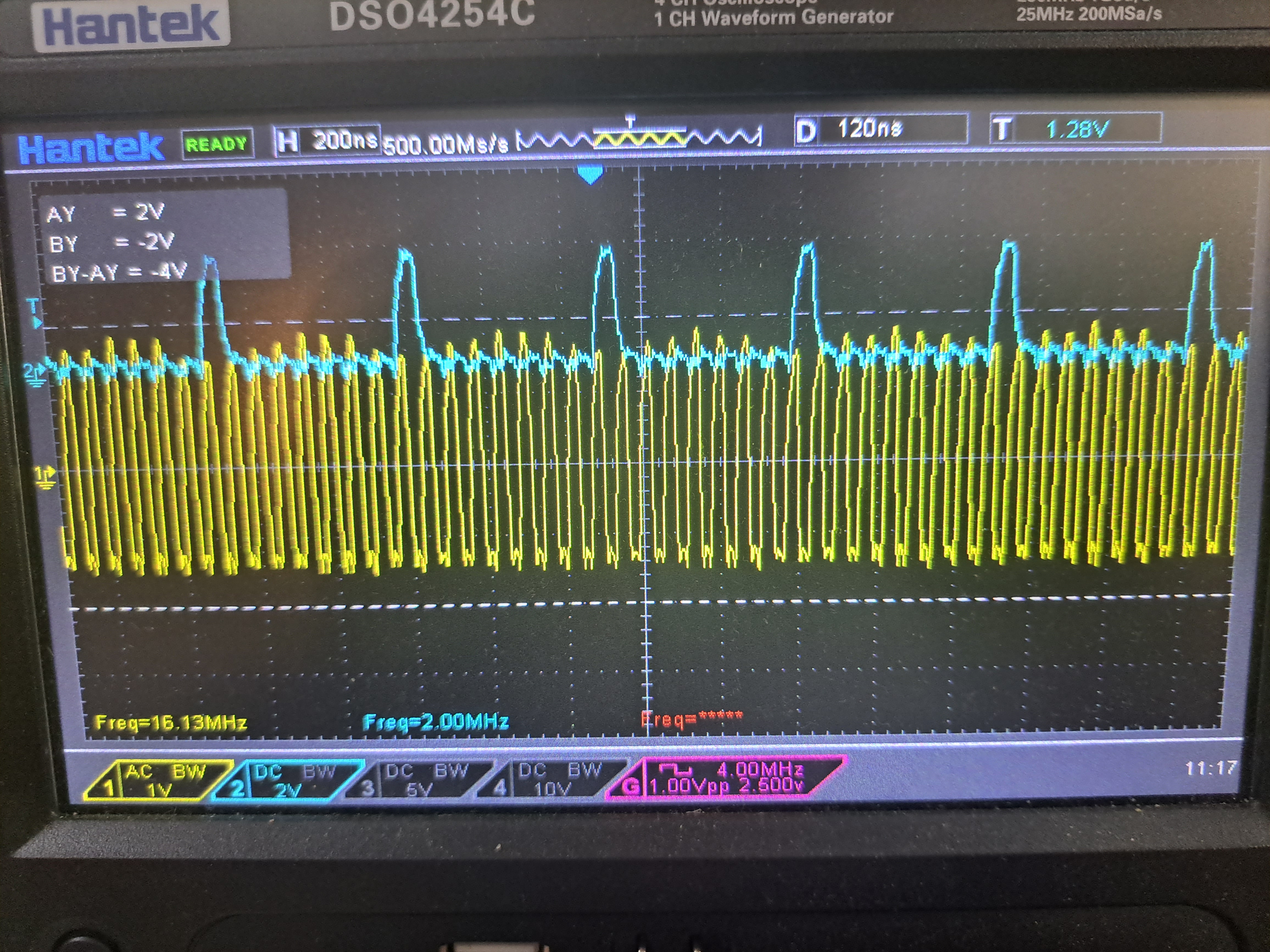 The bottom, yellow line is the CPU clock, the top red line is the I/O clock; the blue line is RDY and the green line is the I/O ~ACT signal.