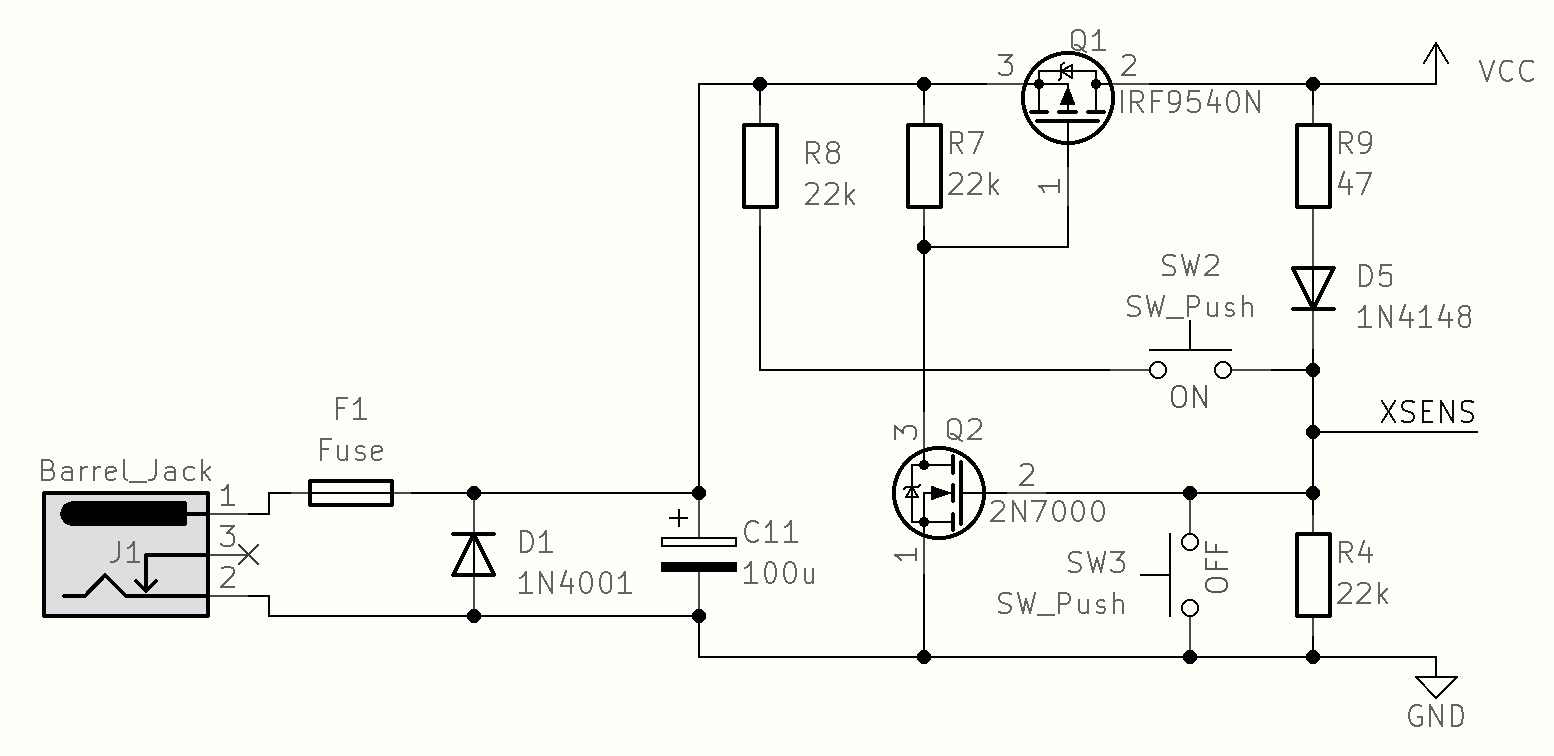One final point that I said earlier I'd come back to explaining - the reason I wanted SW2 to work this way rather than just pulling Q1's gate to ground was that I wanted to make sure that if "on" is pressed while "off" is pressed, or while XSENS is pulled to ground, the circuit would remain off with no current flowing through Q1. The way I have it configured here, that should be the case.