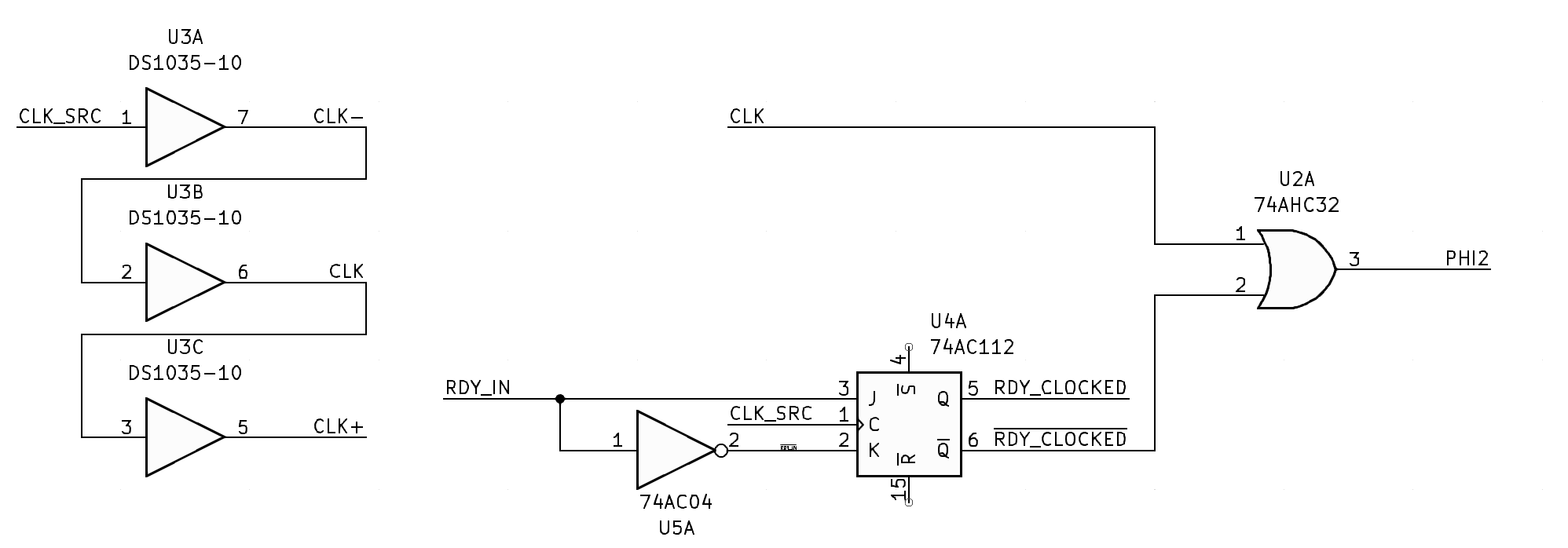 In my newer designs (with 65816 mostly) I use clock stretching when phi2 is high. It works by ORing the CPU's phi2 (and not necessarily I/O phi2, that can actually continue to run, depending on the device) with a stretch signal that is similar to RDY as generated above, but is not only set but also released during phi2 high.
