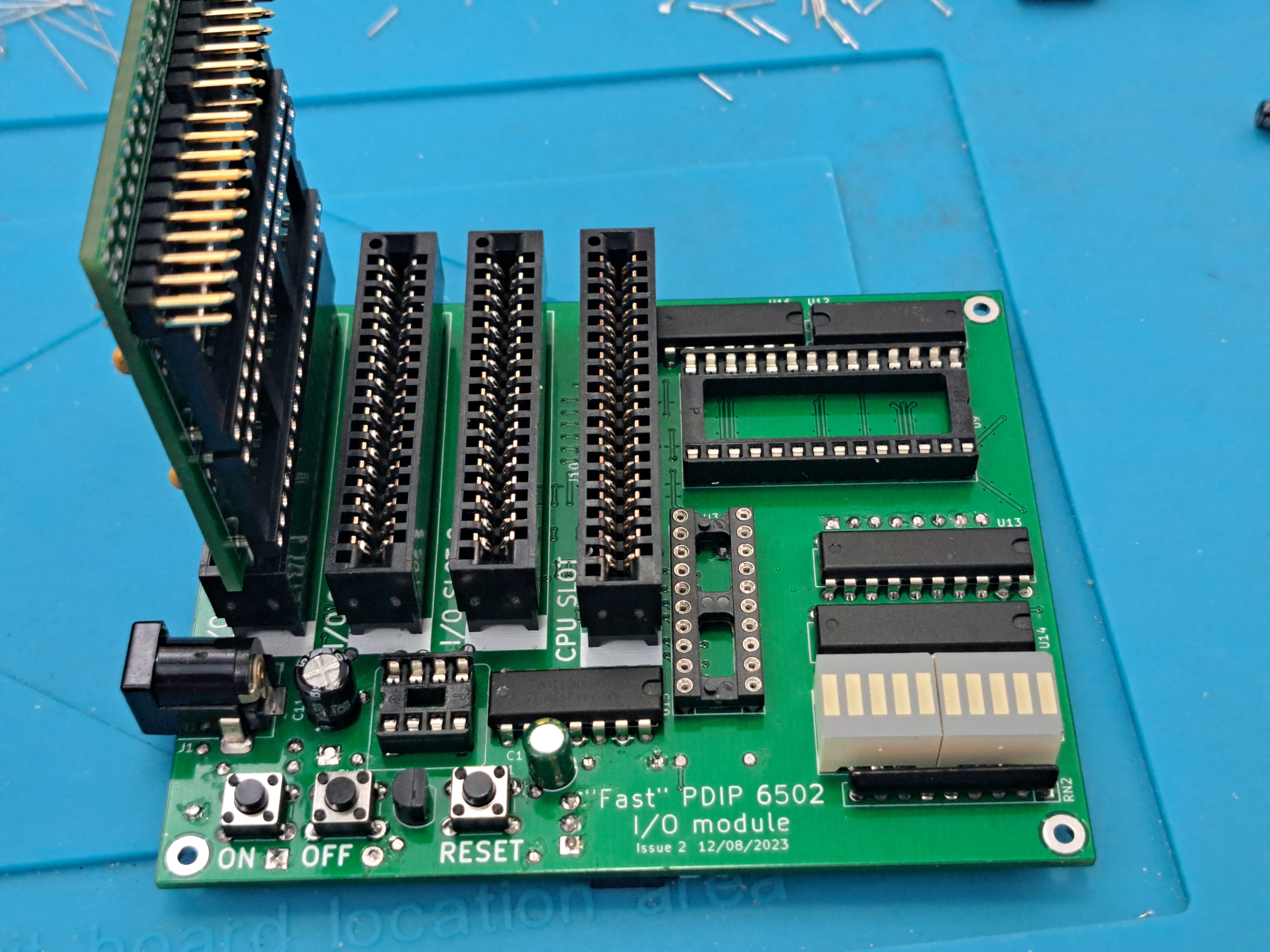 This is coming together - just the CPU board to go. My wife helped with the soldering. The empty sockets are for ROM, a PLD, and the I/O clock oscillator as I'm not sure what speed to go with yet.