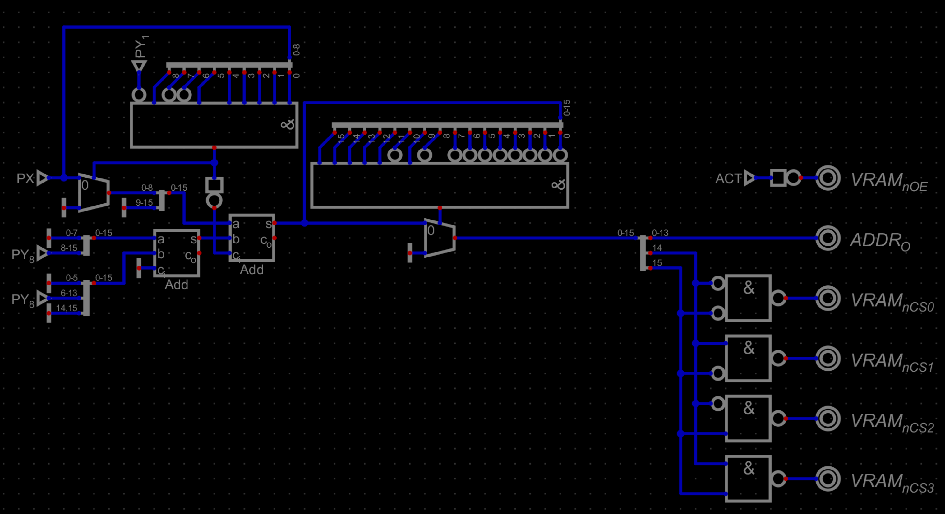 i'm only duplicating a line twice for 320x200, so PY1 refers to the bottom bit of PY (Pixel Y Counter) while PY8 are bits 1-8 of PY, the AND gate on the upper left corner is used for the scanline access wrapping, and the other larger AND gate is for frame wrapping (so the last access loads the first pixel of the next frame).