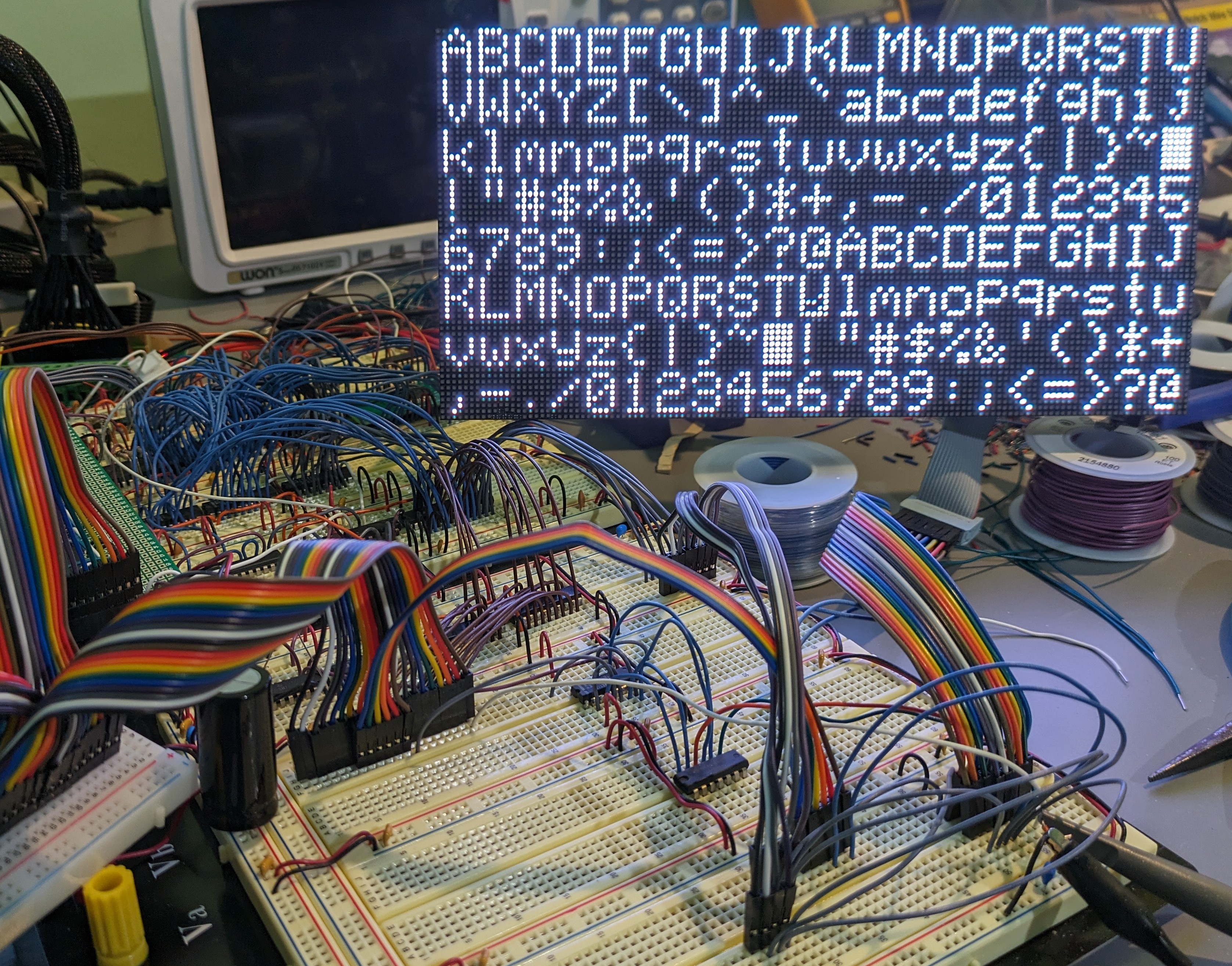 One little gotcha I should have anticipated: the frame buffer rows in memory are off by one relative to the physical position on the LED panel. That is because I’m loading the pixels for a row while displaying the previous row, but I use the loading row’s address as the display address. I would need to add an extra chip to fix this, for example a latch that delays the use of the row address for the display by one row. For now I just fixed this in software, which involved adding one DEC instruction.