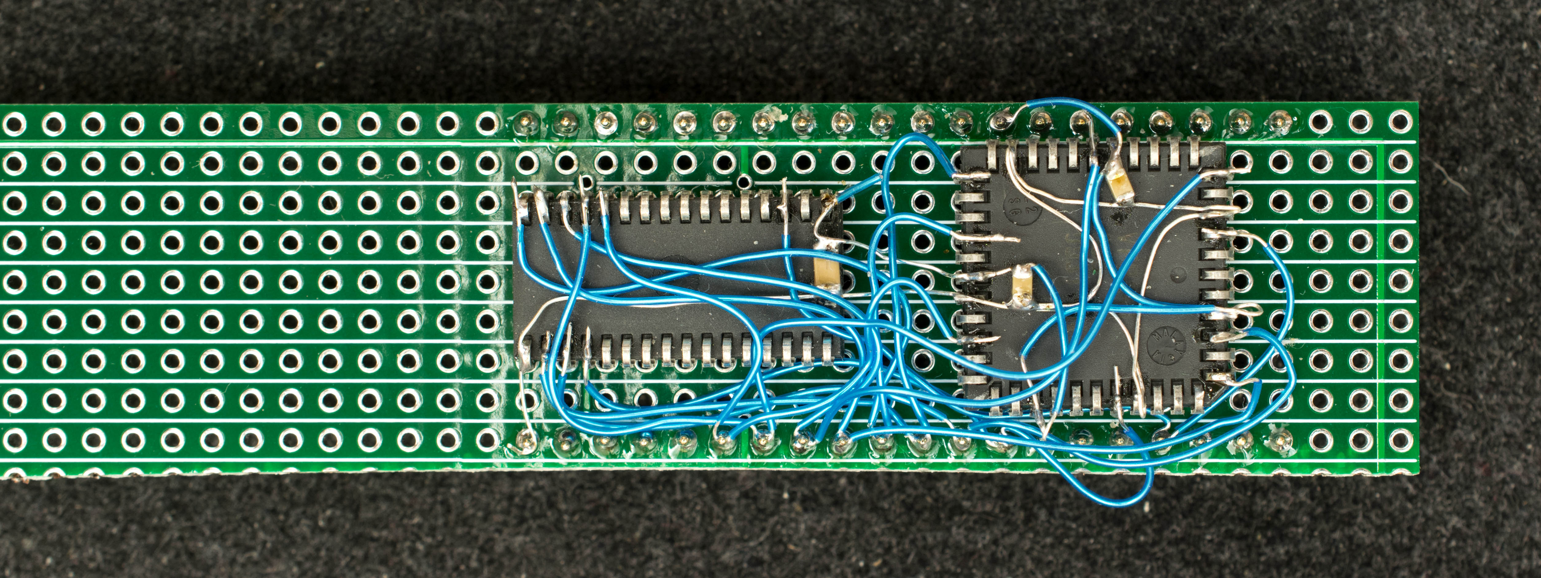 To check out the concept, I have started building a prototype board mounting SOJ RAM and PLCC44 CPLD in "dead bug" fashion on perf board. The two rows of pins are 0.8" wide. The CPLD is pre-programmed with CRC65 equations and the schematic is based on CRC65.