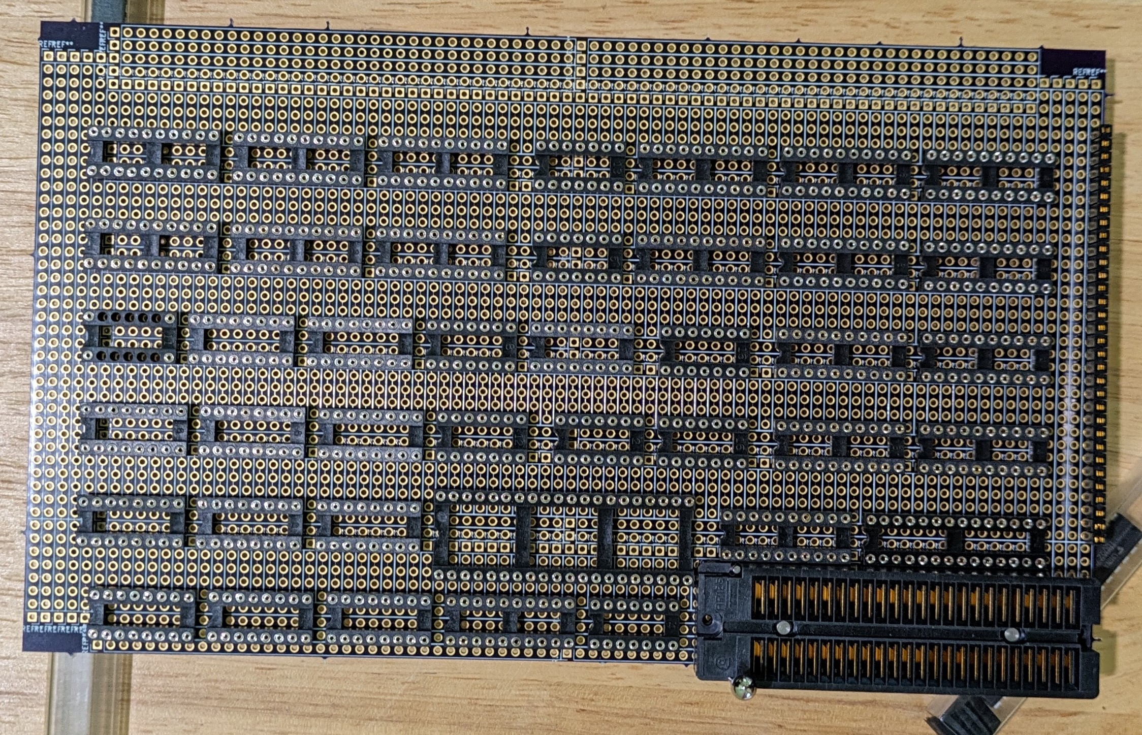 The red lines are where the trace cuts (or edge of the board) would go. Note that I’ve put space between chips that can act as wire fanout enhancers for high-fanout lines like some important clock lines. Anyway, this is an interesting puzzle to work out. Here is what the layout looks like when I put sockets, unsoldered for now, into the breadboard to see how things would work out of what issues might arise: