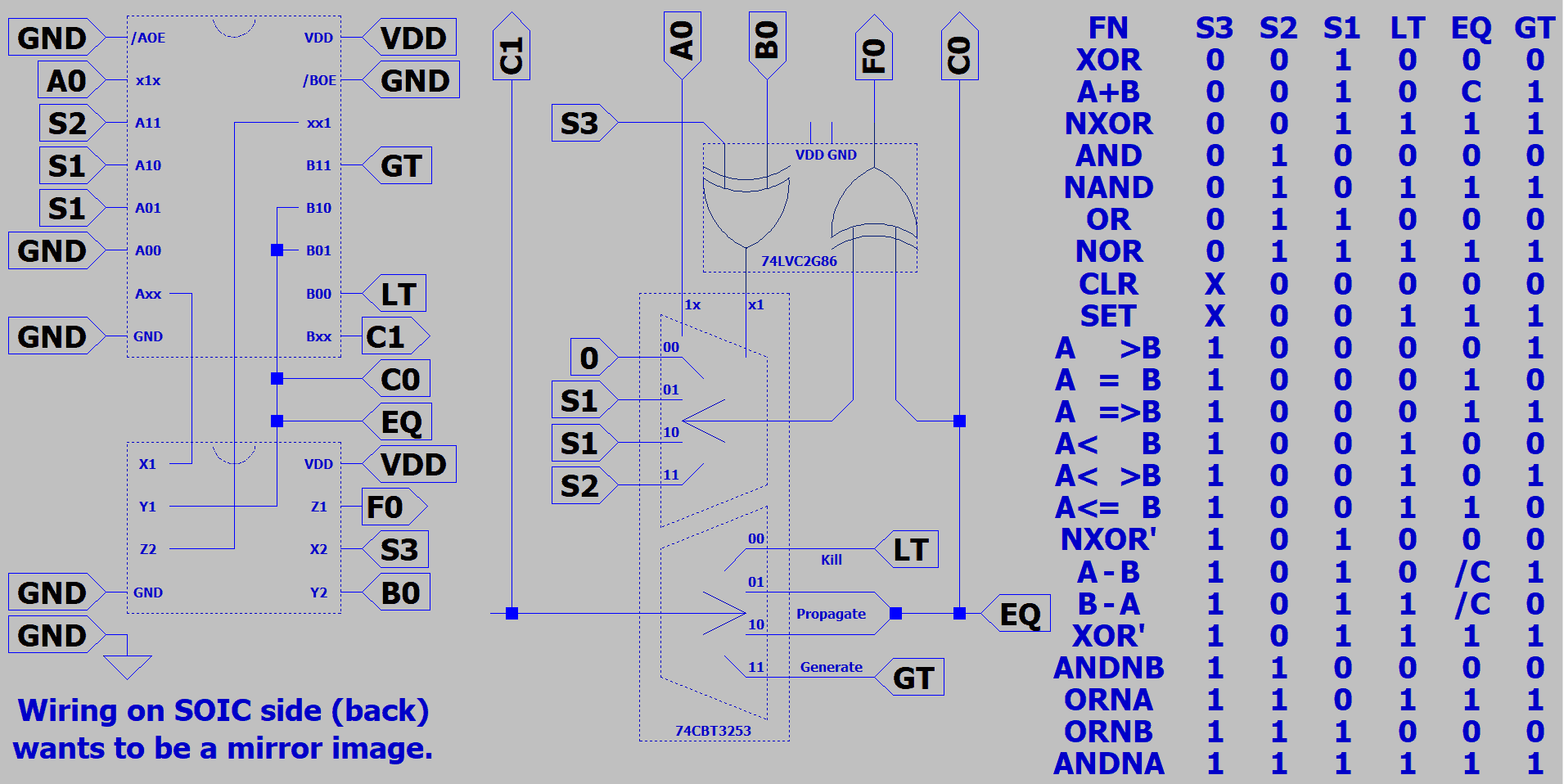 While I'm here, I did want to highlight one ALU design consideration that may not be immediately apparent. And that is the important issue of when control signals are required to be available. This is a critical issue for pipelined ALU designs (like the one used in the C74-100, for example), but may also impinge on non-pipelined CPUs with critical timing requirements.