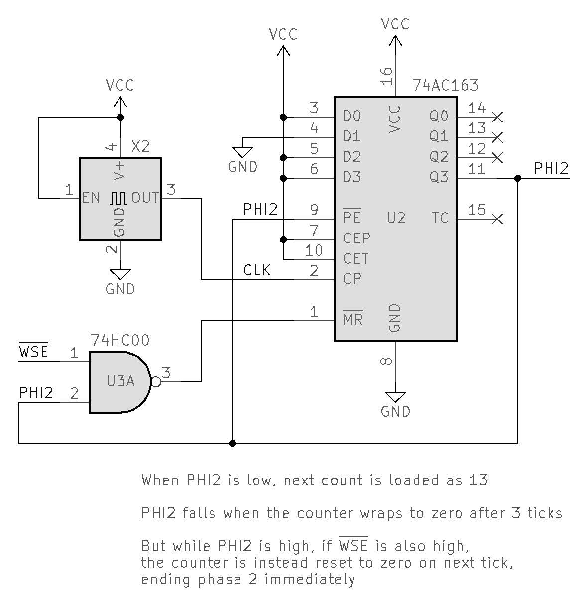 Different counter connections offer different waveform possibilities. If the reload were $A or $9 then the extra clock-low time increases even further. Other variations involve taking PHI2_S from Q1 of the '163 and choosing a reload value of $C or $D... Or, taking PHI2_S from Q0 and choosing a reload value of $E. But in some ways a shift register is more tractable for concocting different different enable waveform possibilities, and it's a shift register (not a counter) that's at the heart of my circuits downthread.