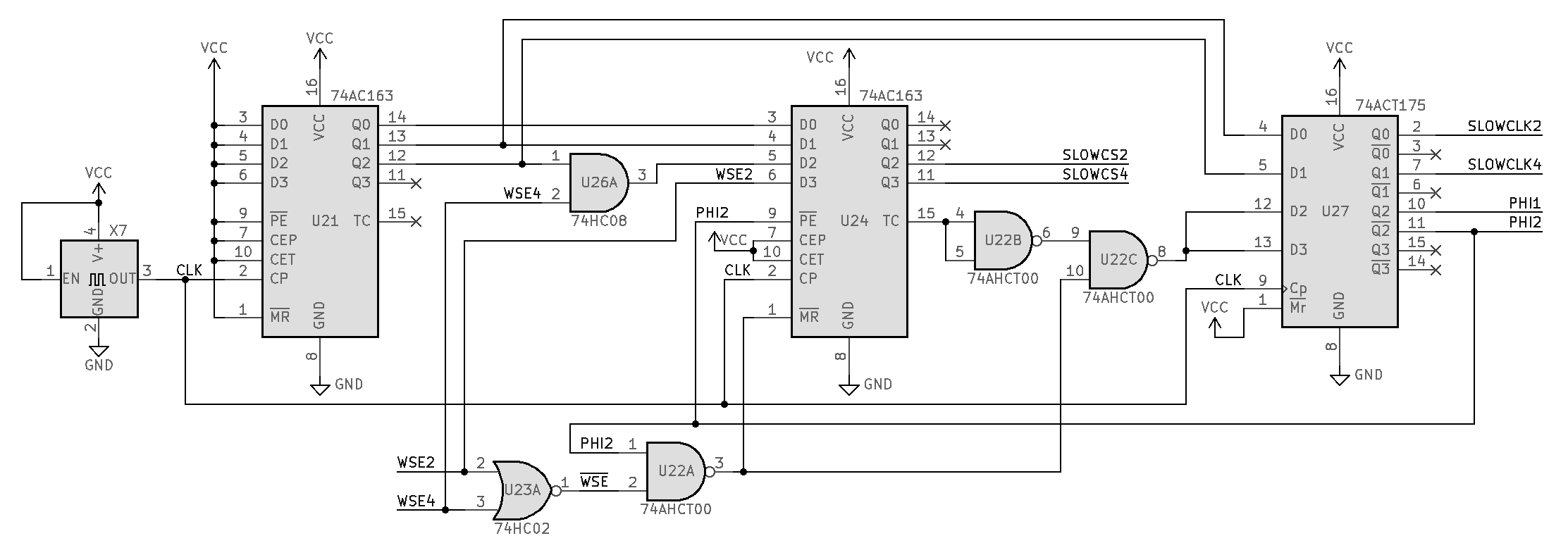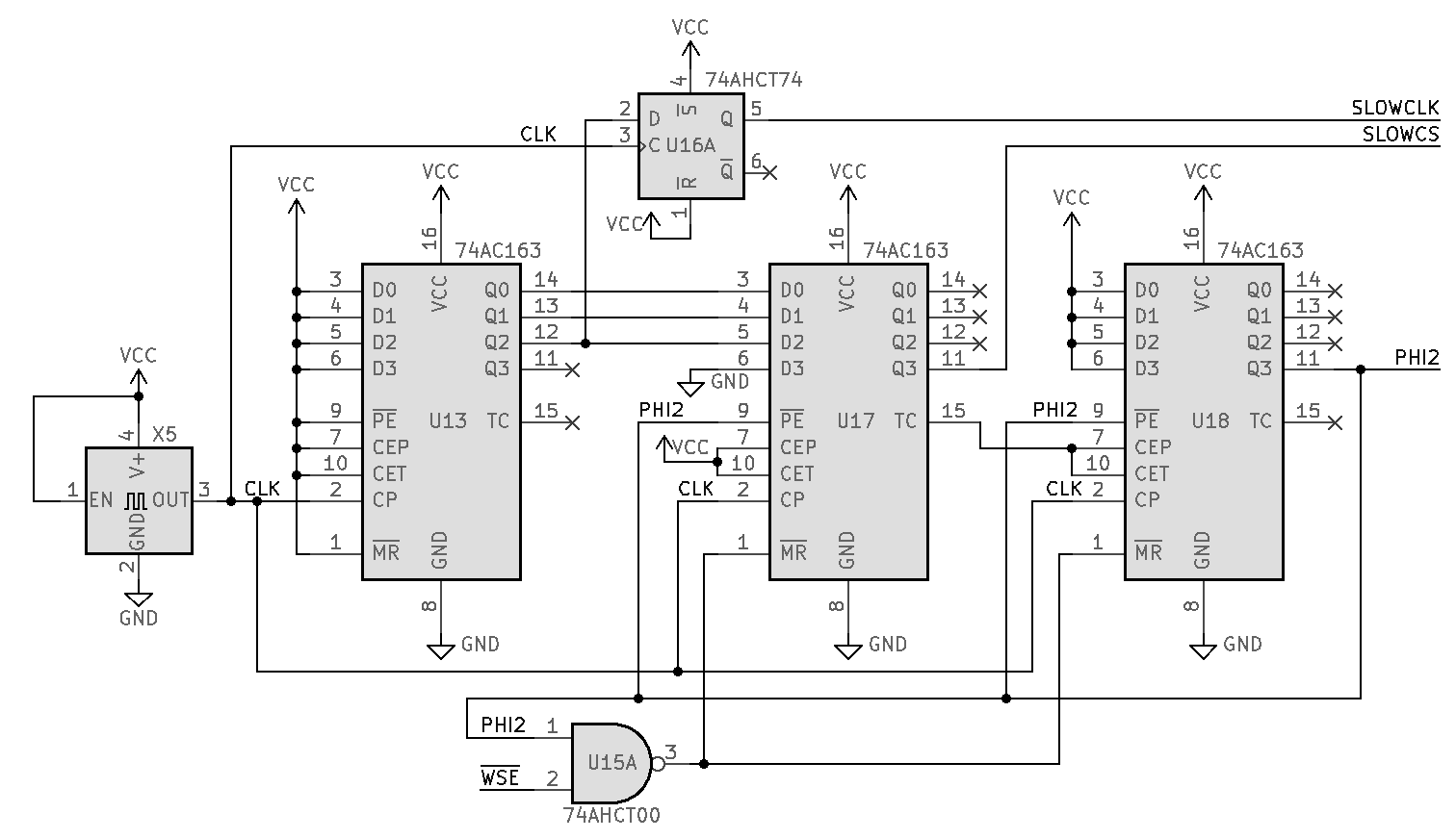 This leads to SLOWCLK=PHI2/4, as desired. All I did here was add another counter IC, chained to the existing one (U17, which was called U2 in the earlier circuit), moved PHI2 to the high bit of the new counter, and moved SLOWCLK and SLOWCS down one bit. You could move them down another bit to get SLOWCLK=PHI2/8, and I think it would still work.