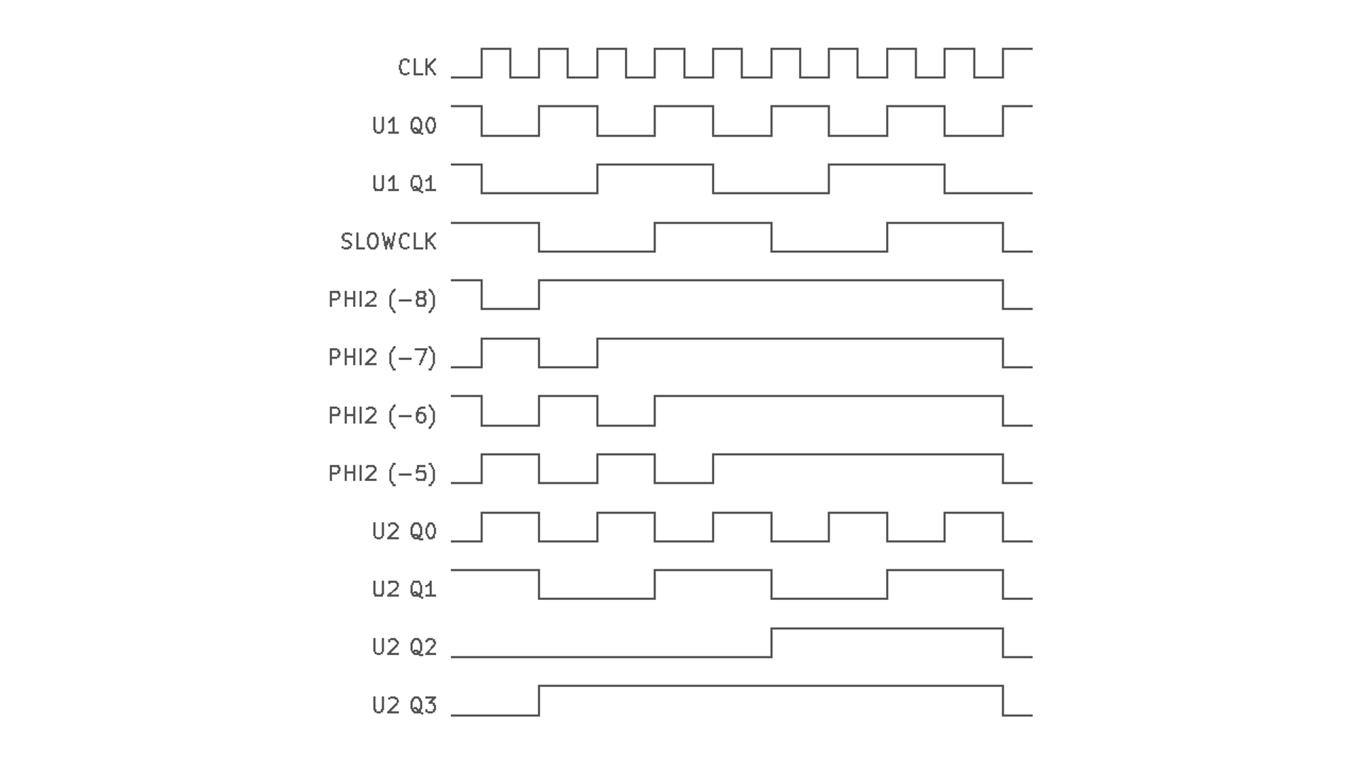 In normal operation then, PHI2 and SLOWCLK will be ticking along, but from time to time PHI2 will be held high to synchronise them: