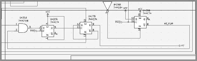 What am I doing here? U428B generates the H7_FLIP signal. This is fed into U427B clock pin. U427B Data input is fed from its /Q output so, whenever H7_FLIP goes high, AM/PM flips. The output rom U429 goes low whenever 12 is on the Hours register (Its input comes from an AND gate fed from the HOURS register). The idea is, whenever we see a 12, H7_FLIP goes high, because this signal is tied to the...mmmm...../RESET??? Big mistake! It should be tied to /SET, with /RESET being connected to VCC. Should be an easy fix too!