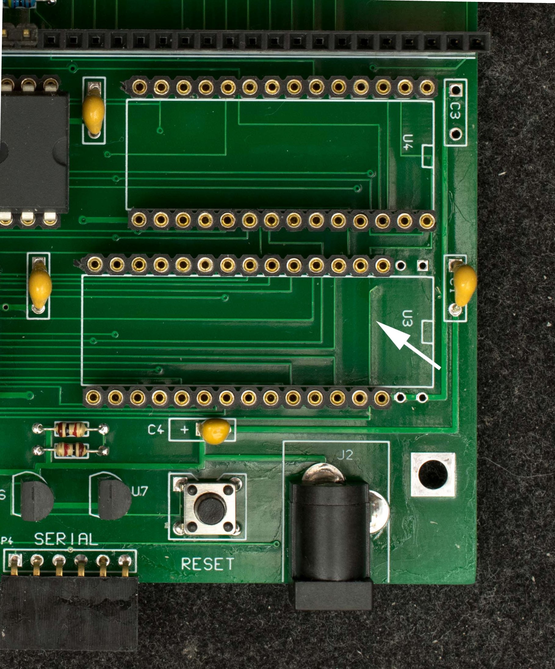 I built up another ZG6502 as a testbed to check out a number of used 6502 and 6551 that I purchased a while ago. ZG6502 design is proven, but the new board won't work, even when populated with working parts from a working board. After a good bit of inspection and troubleshooting, I finally discovered two broken traces on the problematic board. These broken traces were under the solder mask, so they were broken during the manufacturing process. Here are side-by-side comparison of the assembled board vs bare pc board. The broken trace is the one pointed with the white arrow. The trace should pass through pins 3 & 4 of U3 as shown in the bare pc board, but you can see the trace was broken and pushed off at a 45 degree angle in the assembled board. There is another broken trace but it is under the socket and hard to photograph.