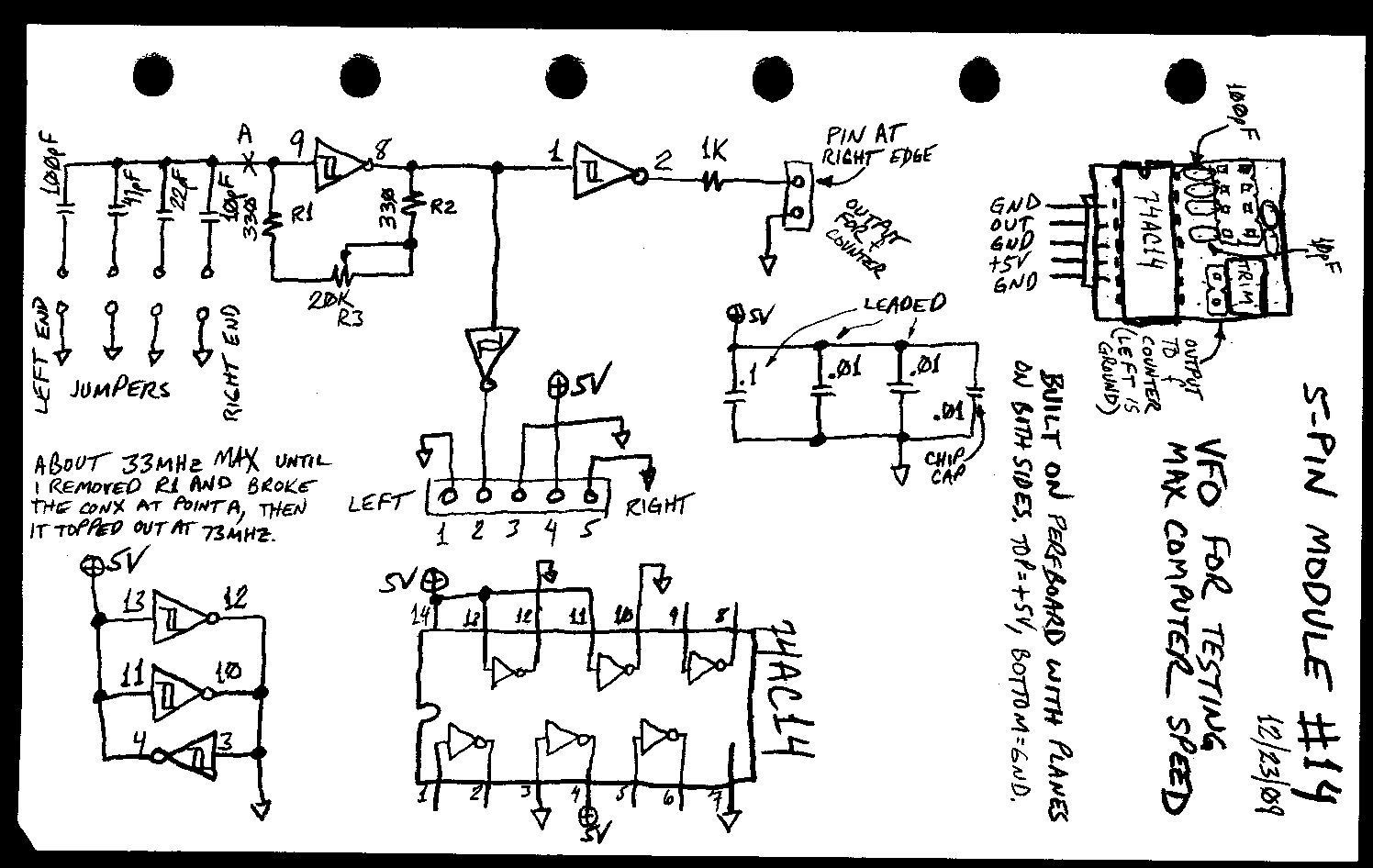 I initially had a little pin header for jumpers to select additional input capacitance for lower frequency ranges as shown in the upper-left corner of the drawing, but even with none of the jumpers installed, the tiny bit of capacitance between the top pins and ground was holding the maximum frequency down, so I cut the connection at point A (marked with the "X", near pin 9), and also shorted out R1, bringing the max up to 73MHz. After dividing it by two with a flip-flop, that makes for 36.5MHz which is at least 50% faster than I expect to get from a home-made 6502/816 project. There are 6502's that will do 200MHz, but they're part of a custom microcontroller that's for a specific use, and have memory and I/O onboard the same IC. Even if they were made a standard product, you wouldn't be able to get fast enough logic and memory for it or build suitably for running that fast.