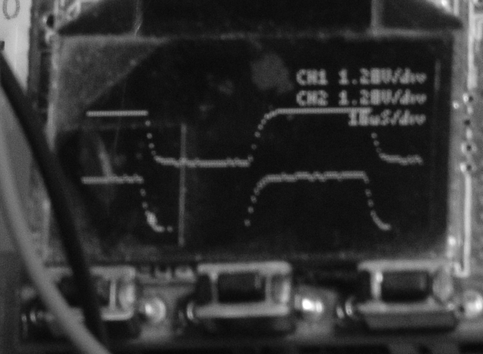 The voltage shown is either zero or 5V, Channel 1 is Clock, left wire (black), top line, Channel 2 is Data, right wire (red/grey), bottom line, Trigger is on Data fall edge, moved to left part of screen.