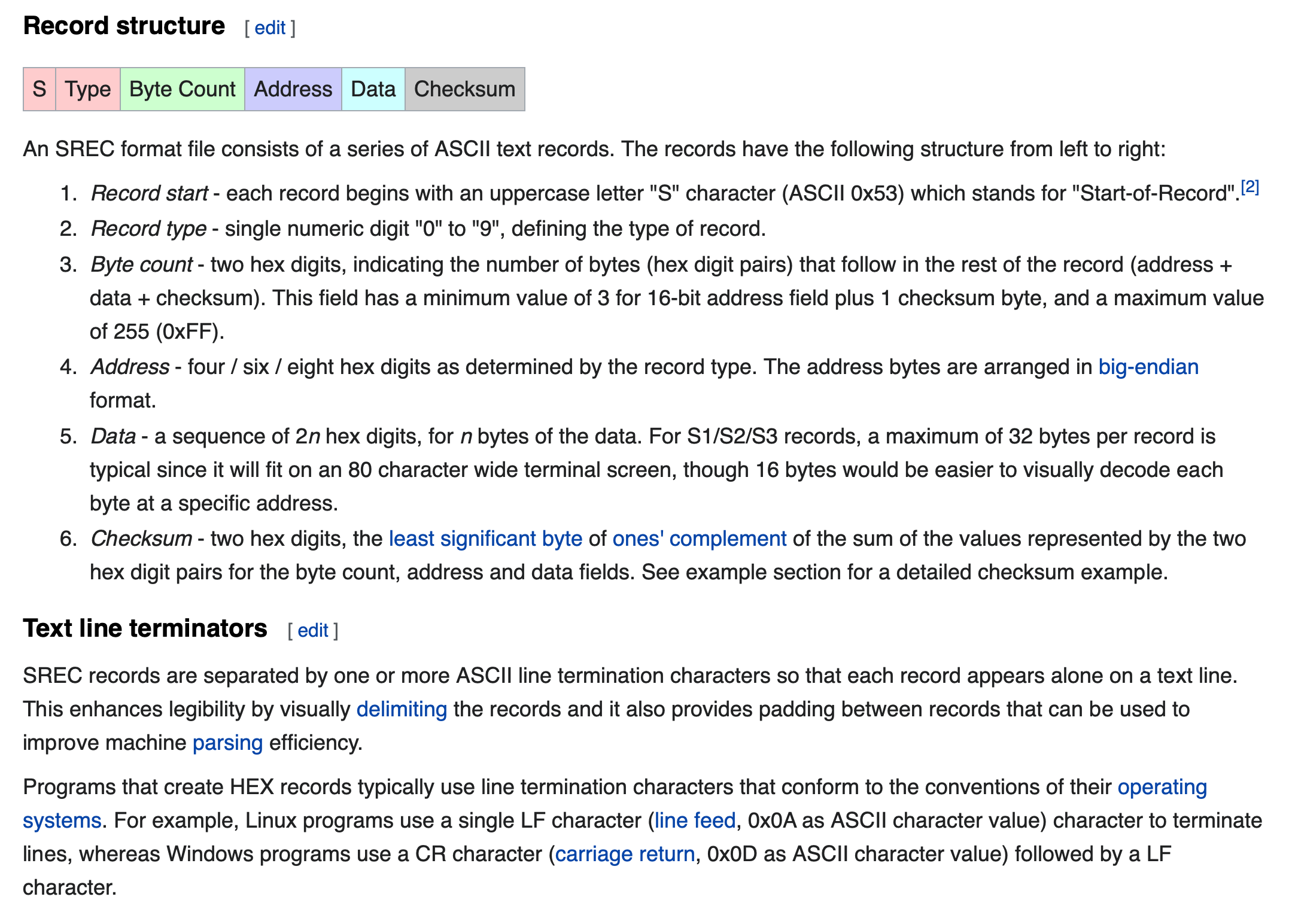 Motorola S-record is a file format, created by Motorola in the mid-1970s, that conveys binary information as hex values in ASCII text form. This file format may also be known as SRECORD, SREC, S19, S28, S37. It is commonly used for programming flash memory in microcontrollers, EPROMs, EEPROMs, and other types of programmable logic devices. In a typical application, a compiler or assembler converts a program's source code (such as C or assembly language) to machine code and outputs it into a HEX file. The HEX file is then imported by a programmer to "burn" the machine code into non-volatile memory, or is transferred to the target system for loading and execution.