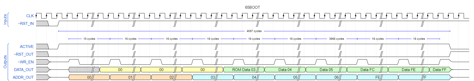 - When the ACTIVE_OUT pin is high, the SBC must: ensure all other devices on the data bus are tri-stated; the low half of the address bus is tri-stated; the upper half of the address bus is held in desired state for where the bootloader will be copied (most likely 0xFF); The ~WRITE_OUT pin has exclusive control of the ~WE input (or equivalent) of the RAM to which the bootloader will be copied; any other control inputs (OE, CE) to the said RAM are appropriately set. As an example, the databus and address bus could be handled by routing ACTIVE_OUT to BE on the 6502 and having pull-ups on A8-15.