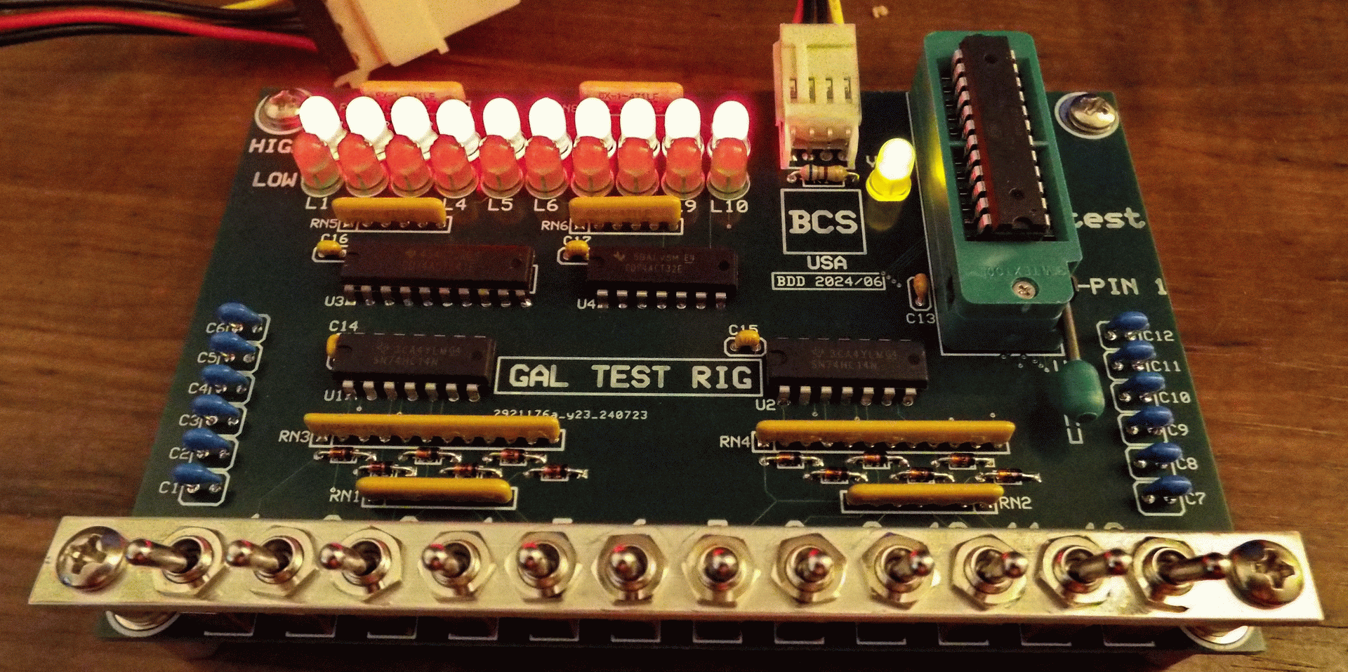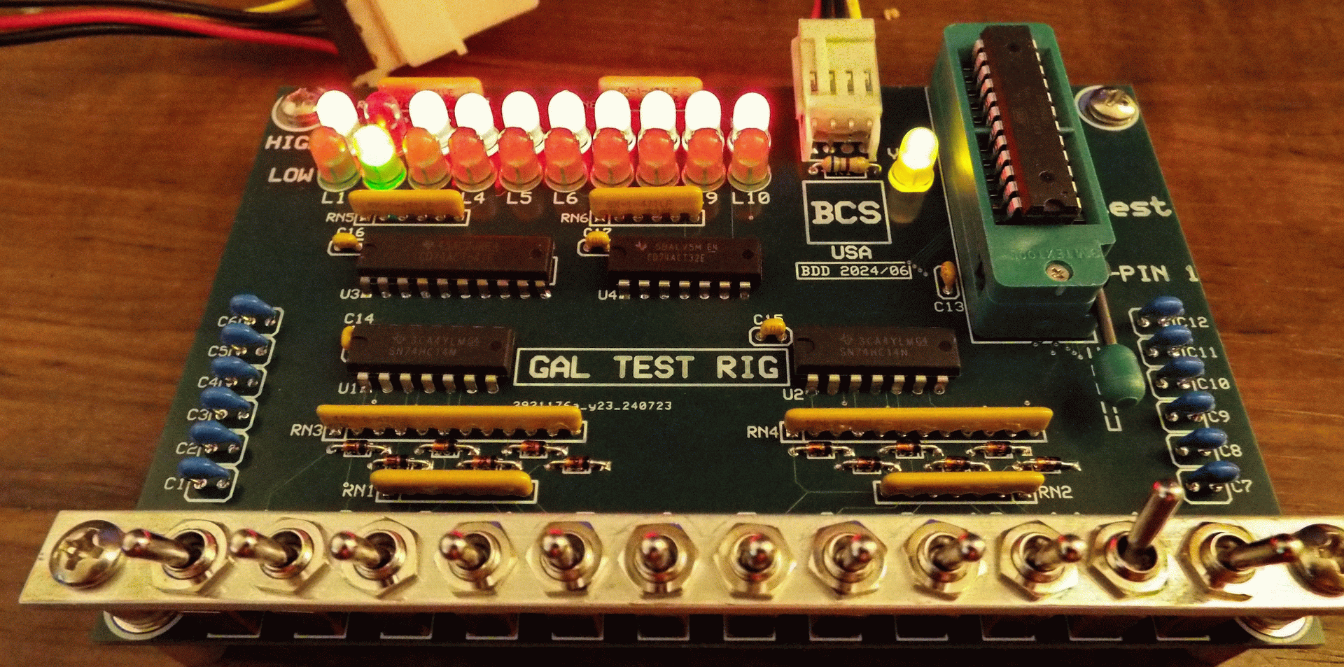 While it is possible to monkey-rig a GAL and some LEDs on a breadboard, a breadboard’s sometimes-flaky connections may introduce problems that will produce false results. I figured it would be better to build a test gadget that could produce repeatable results, which meant it had to be fault-free in all respects. So what I’ve done is expand on the monkey-rig concept to produce something that is easy to use, unambiguous in operation...and trustworthy.