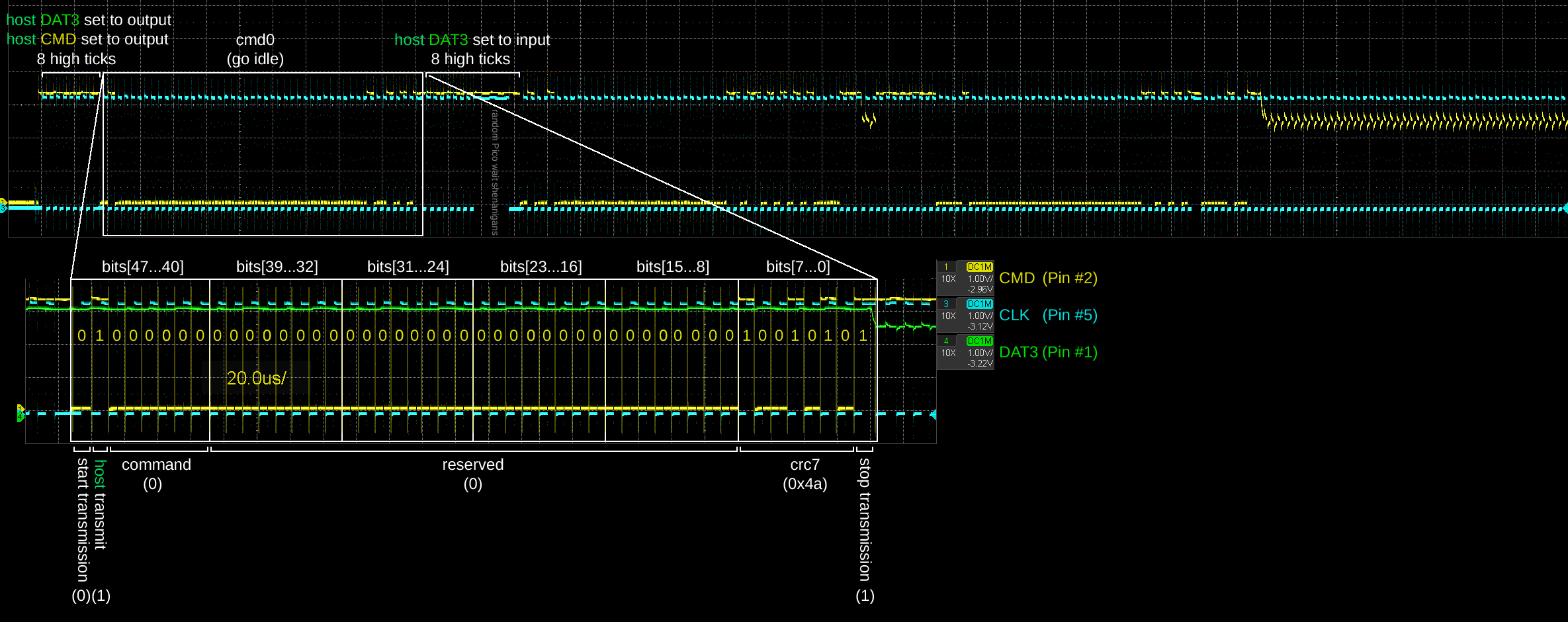 In the attached oscilloscope screenshot you might have seen that I hold the clock high for some time after I'm done ticking cmd0. That's not intentional, it is an artifact from the Raspberry Pi Pico I'm using to bit-bang out the signal. I suspect it has something to do with the debugger but having it attached or not makes no difference. The Pico pauses occasionally but very consistently.