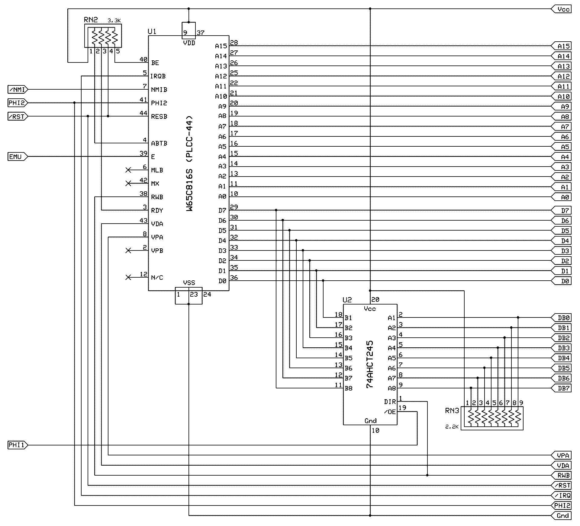 My current understanding is that unlike the W65C02, it latches data during read cycles and attempts to write data during the falling edge of PHI2. All this should work with the recommended schematic listed lower in the datasheet. I planning to pair this with an HM62256 (32k x 8) memory chip controlled by the CS# pin. OE# is connected to the inverted RW# signal on the '816, and WE# is connected to a non-inverted RW#. CS# is connected through with a a NAND between an inverted PHI2 and the address decoding logic. Is this a typical design that would work semi-reliably?
