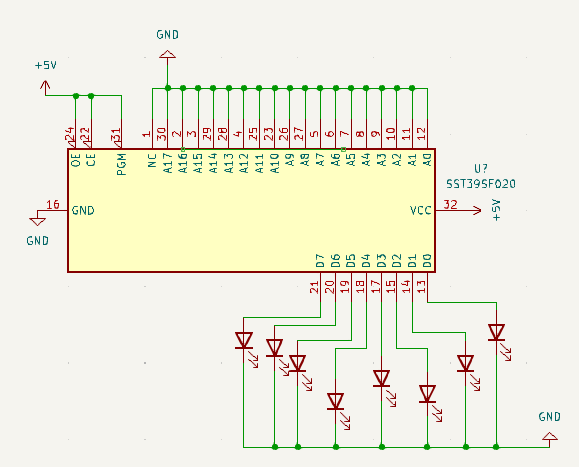 • I have no floating pins. All address pins are wired to the ground rail (so I would expect it to be fetching the data at address $00000), as are the #CE and #OE lines, while the #WE is wired to 5V. The NC pin is also wired to 5V.