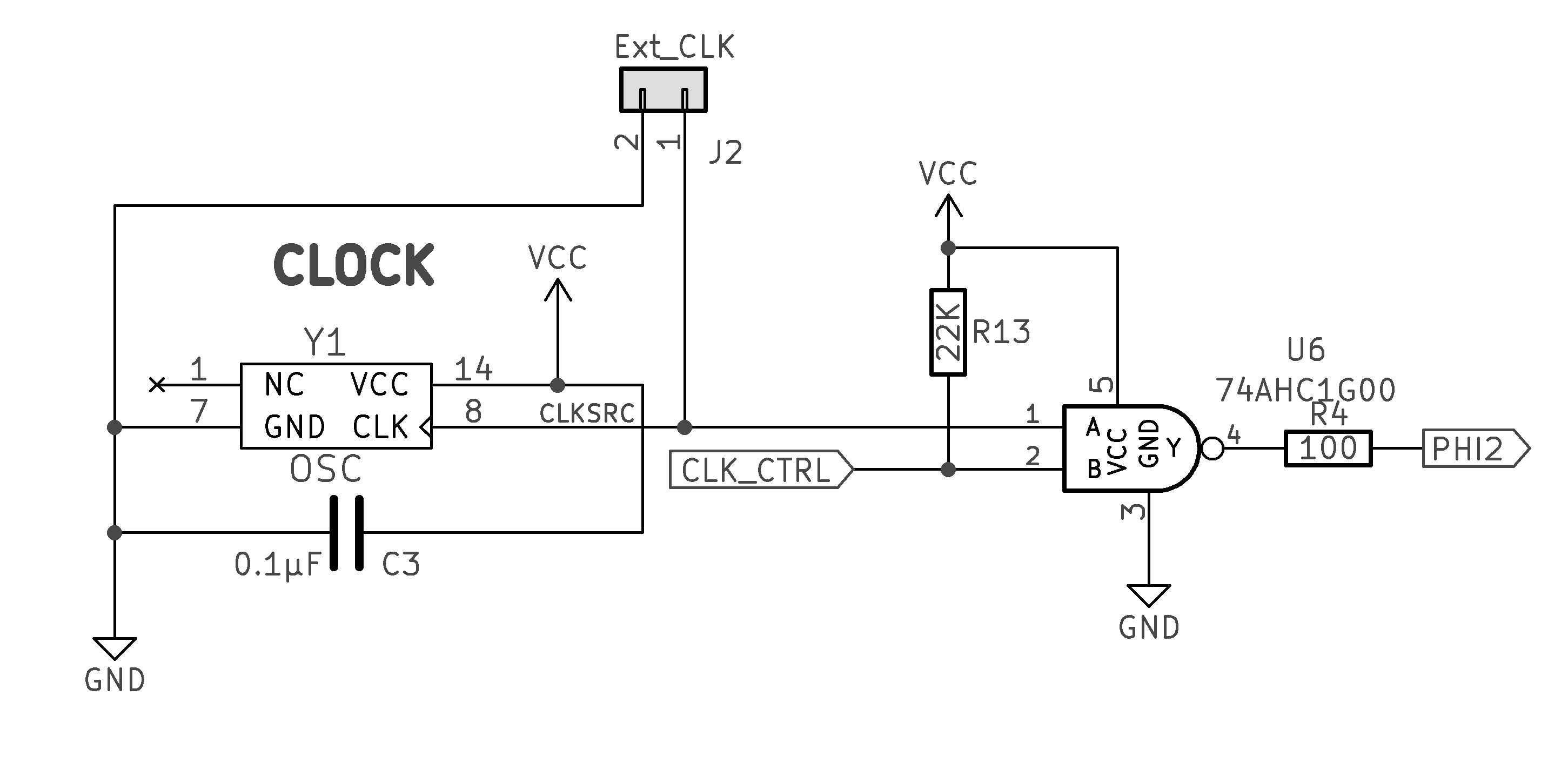 Unless you are using a clock oscillator with an output-enable control pin, you need to run the oscillator’s output through a gate so you can control Ø2. In order to be able to halt Ø2 in the high phase, you can use a two-input NAND gate, with one input driven by the oscillator and the other controlled by the MCU. If the MCU-controlled input is driven high, the gate’s output will oscillate. If the MCU-controlled input is driven low, the gate will output a continuous high, which effectively halts Ø2 in the high phase. For best performance, the NAND gate should be 74AC to produce low, single-digit transition times as specified for the WDC MPUs’ clock input.