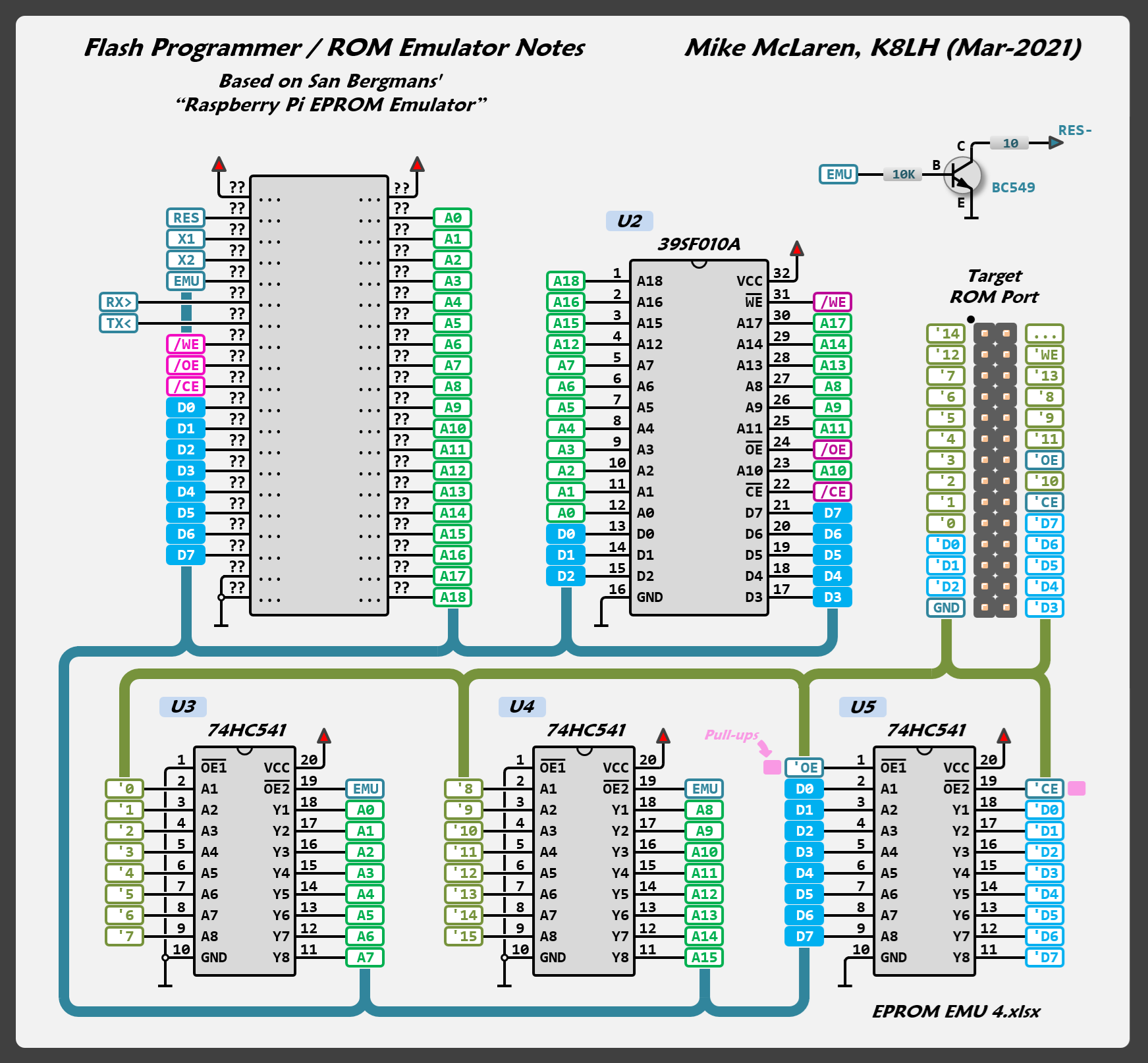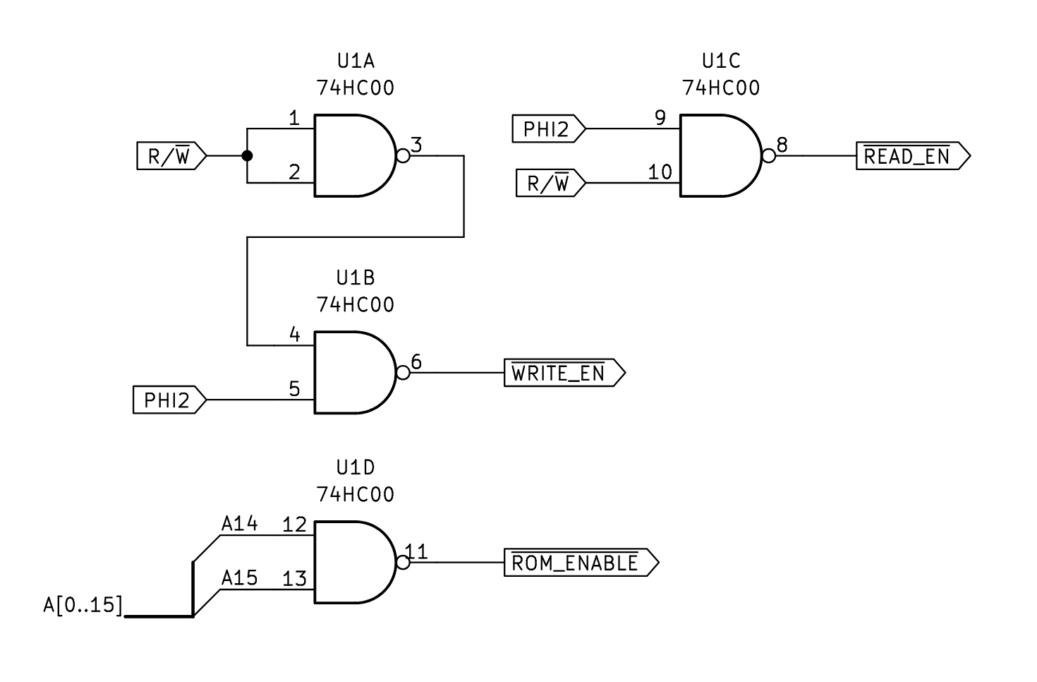 With BE pulled low by the MCU, the address bus, data bus and RWB will be tristated, so the MCU can take control of those. With the PHI2 kept high and RWB set to LOW by the MCU, /READ_EN will be high, which is what we want most of the time. Should I want to perform a read of the flash (eg, for verification) the MCU can take the RWB high, making /READ_EN low. (FYI, the write-enable pin of the flash is under the sole control of the MCU).