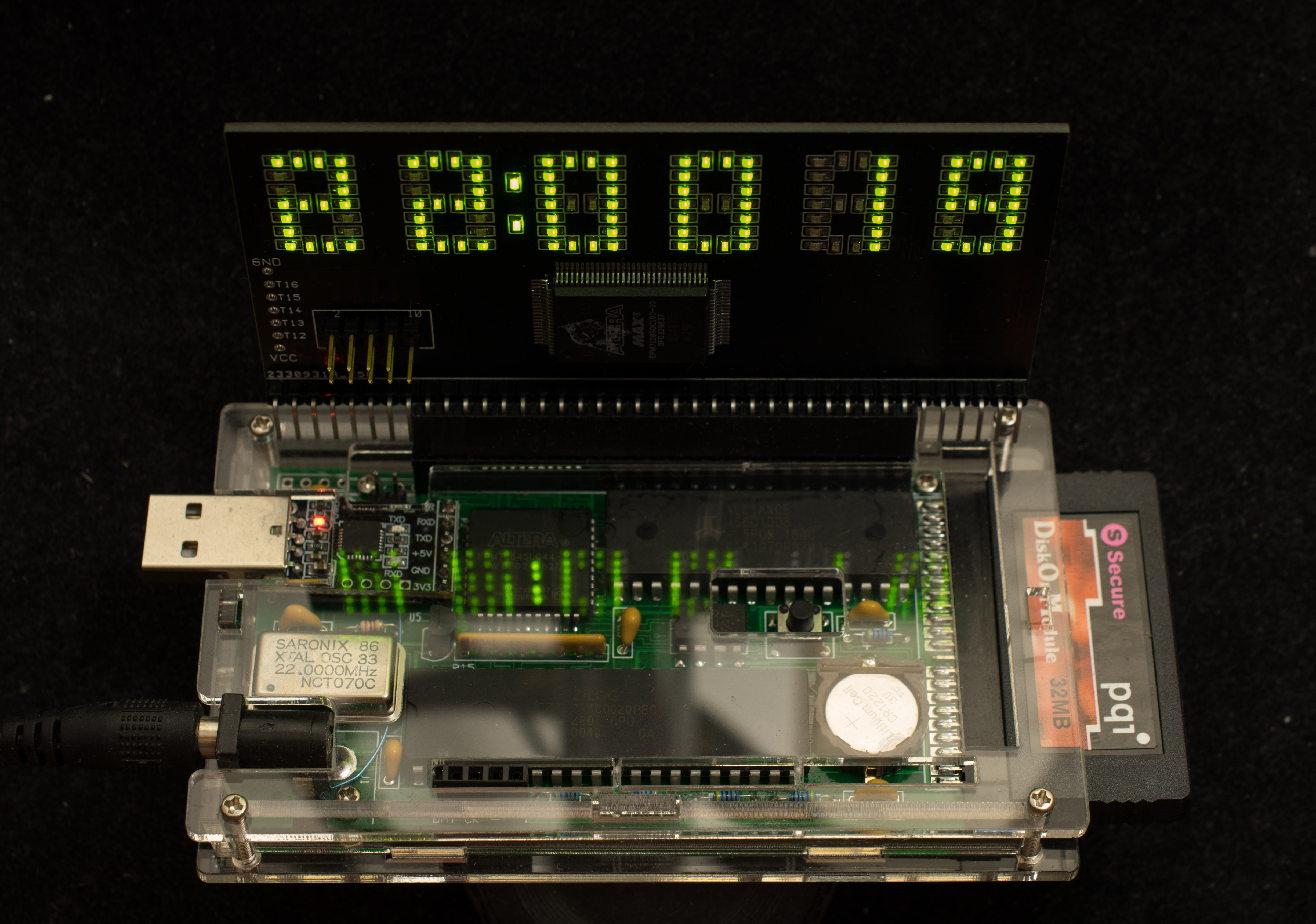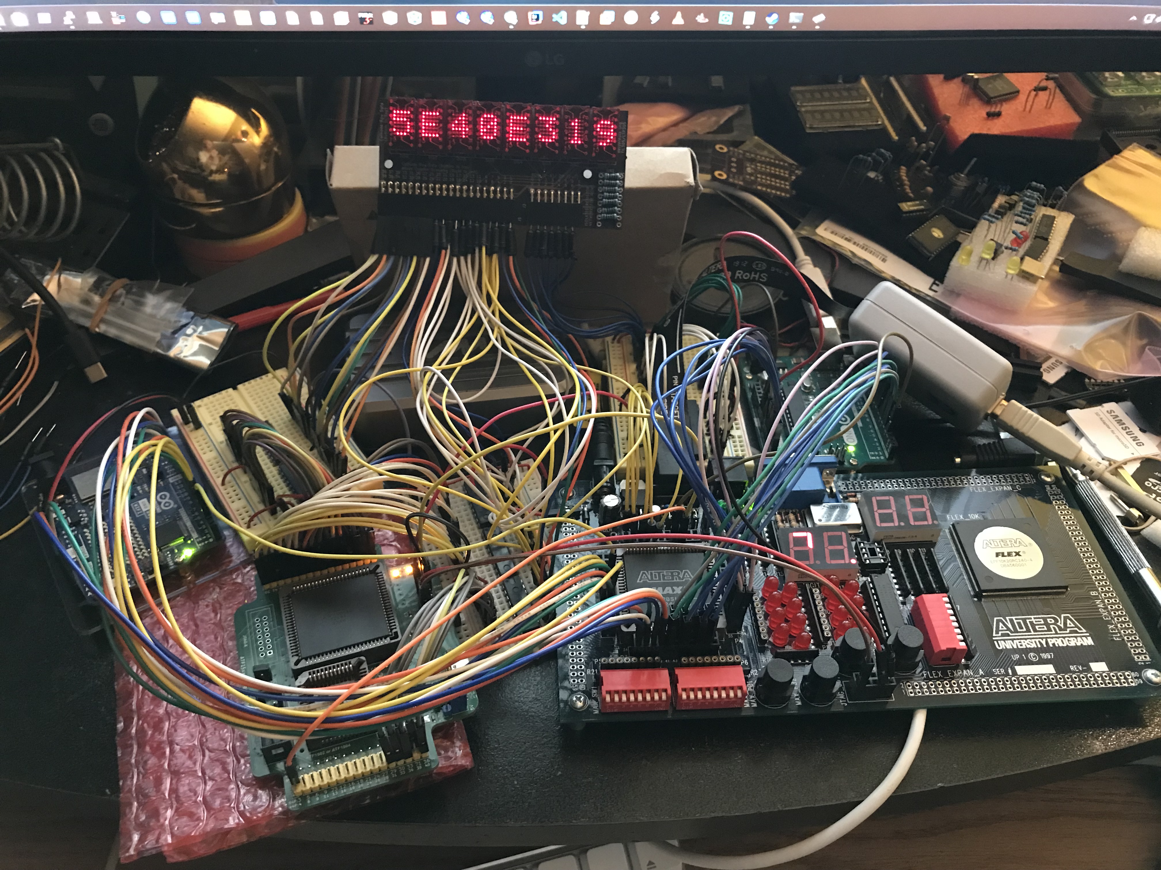 All of this has been prototyped using Altera evaluation boards, ATF15xx boards, bread boards, darlington arrays (UDN2982A for the columns, ULN2803APG for the rows) AT28C16 (character ROM), etc. I've been simulating 32 bit data input from an external source.