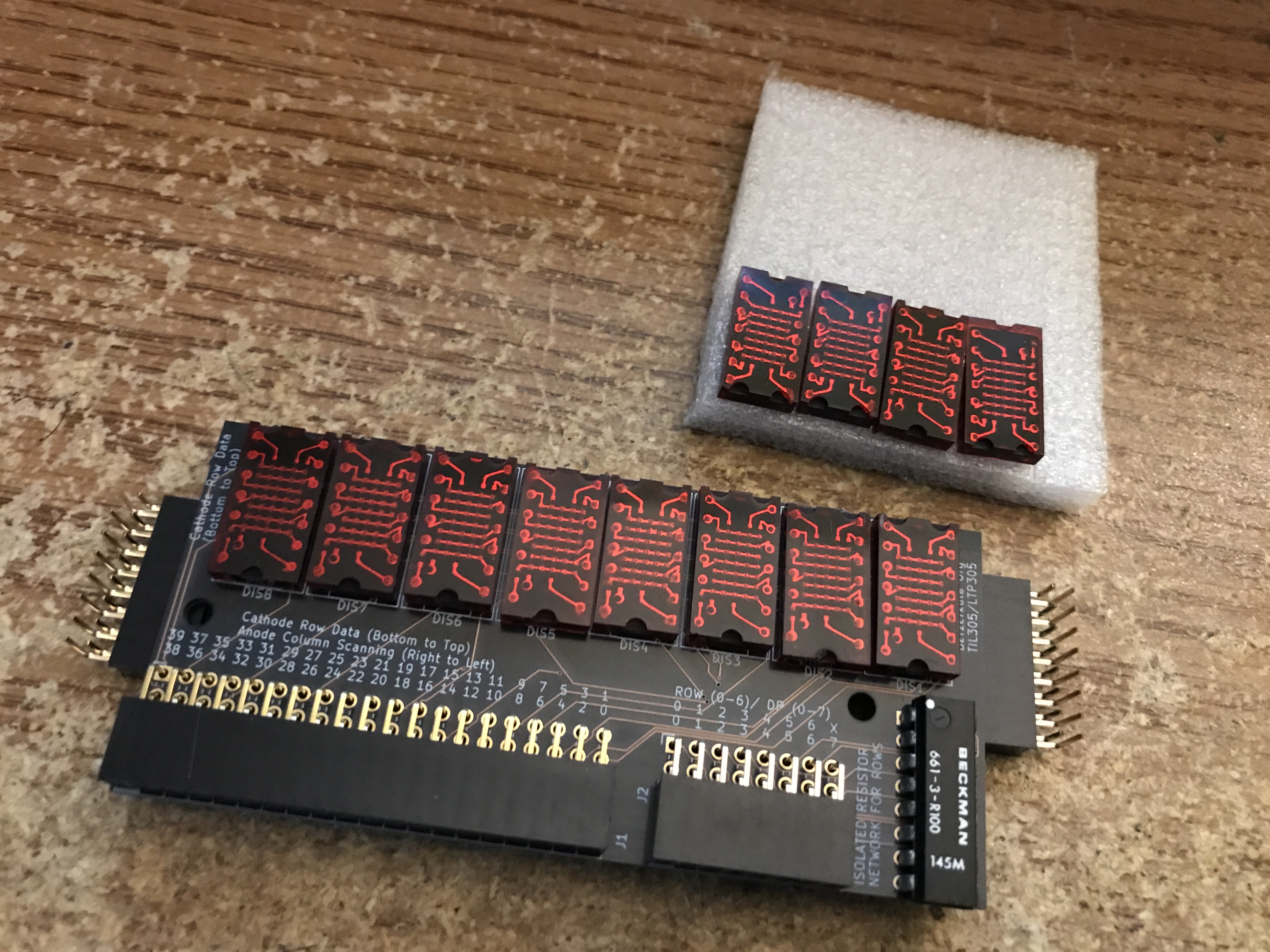 I present the 8 digit 5x7 custom driver! Still a huge work in progress! (Only recently fabricated a PCB for the 5x7 displays with anode column/decimal point with cathode row limiting resistors.