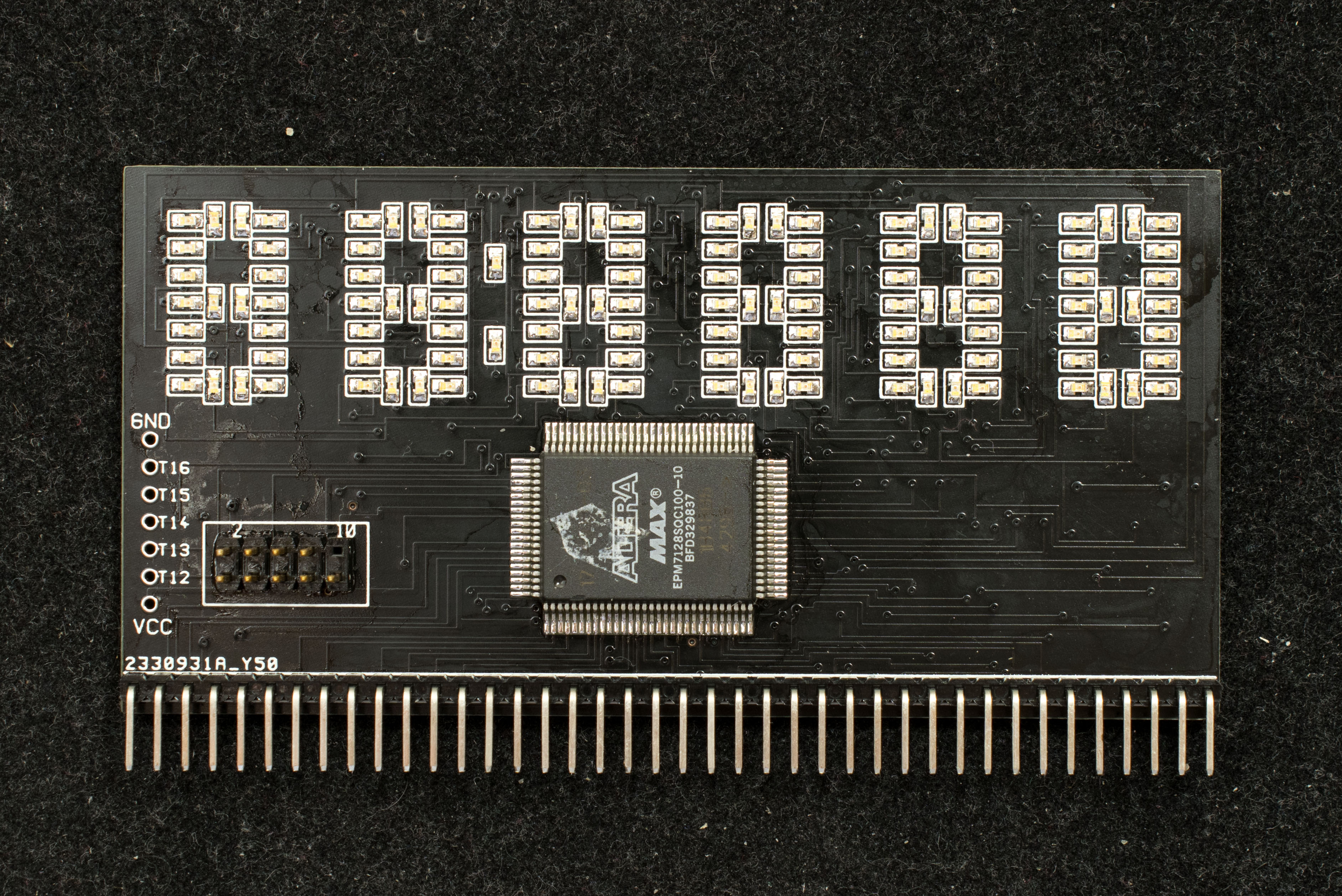 It took quite a bit of work getting to this point, but starting with figuring out how to multiplex a 5x7 display, column scanning (programming a custom ring counter) and sending row data and keep it synced took quite a bit of effort. However, it is possible using 2 EPM7128/ATF1508AS CPLD's with supporting driving hardware.